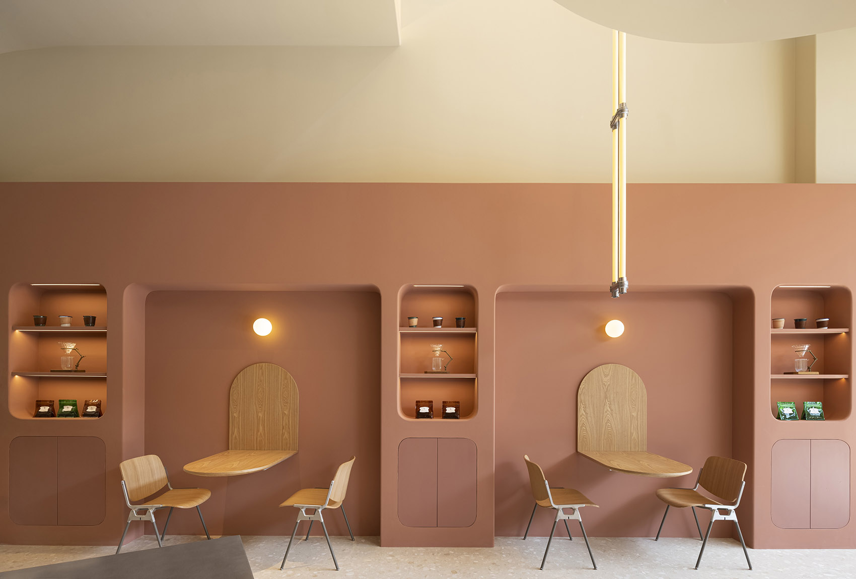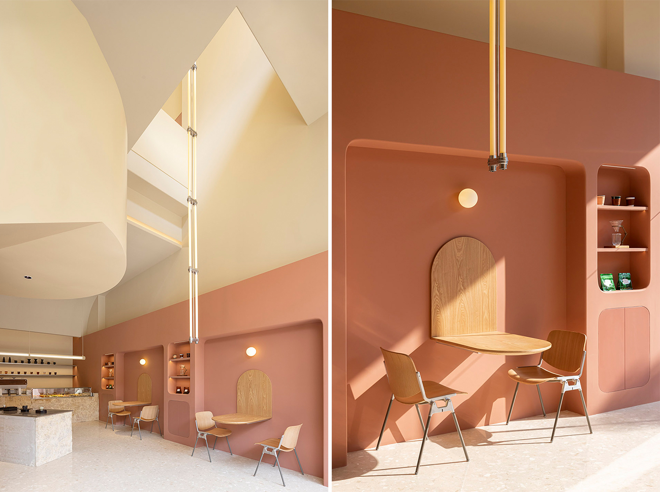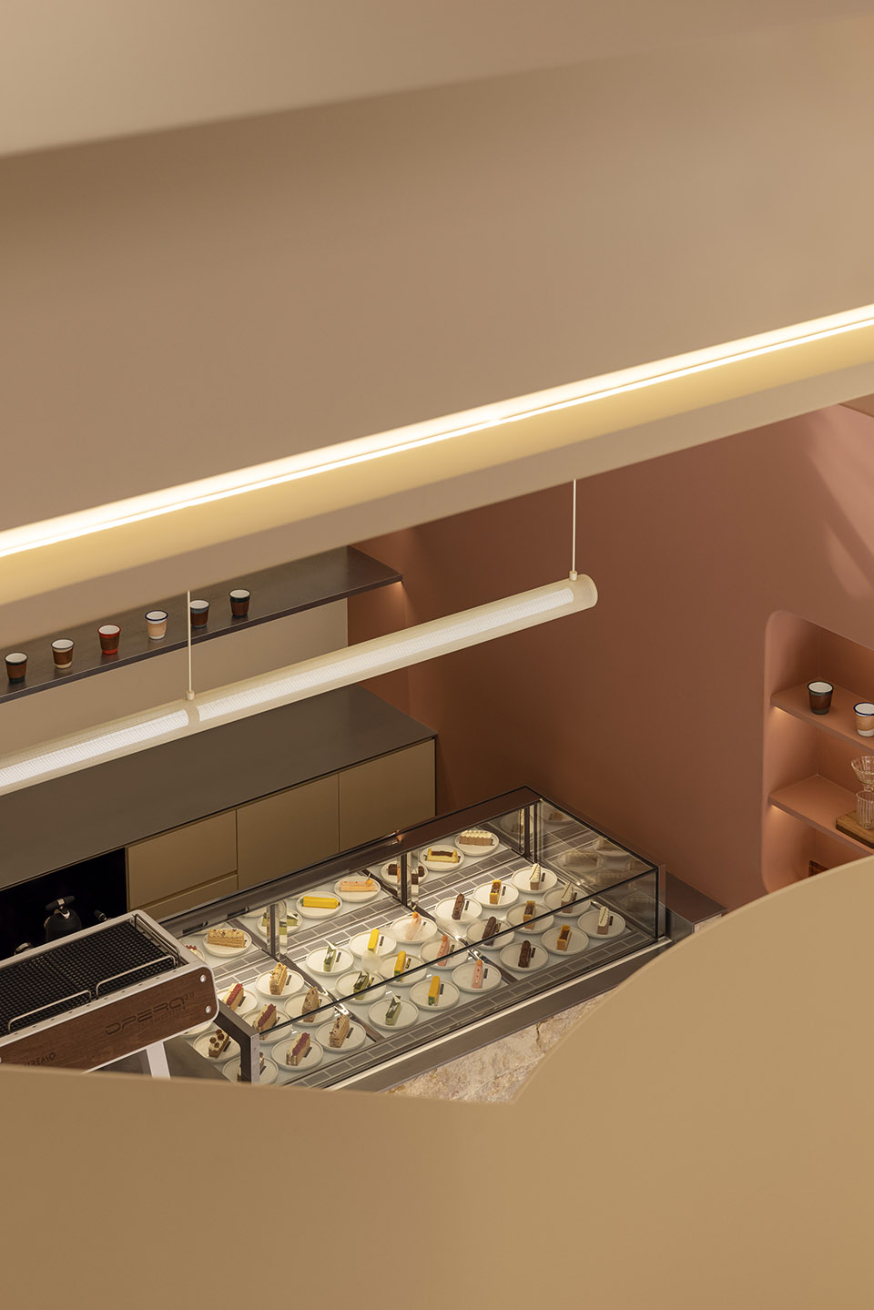 十二糖的logo “B/12″源自西点甜度衡量指标 — 白利糖度 Brix。B/12代表最适宜的甜度12° Brix。从字母“B”中提取出半圆,结合“奶酪”的圆润弧线,与小五内心想表达的“柔软”不谋而合。于是,弧线成为新店的主旋律,从入口的隔墙、楼梯的平台,到用餐的桌椅、导角的吊顶,都如奶酪般游走在空间店铺里。