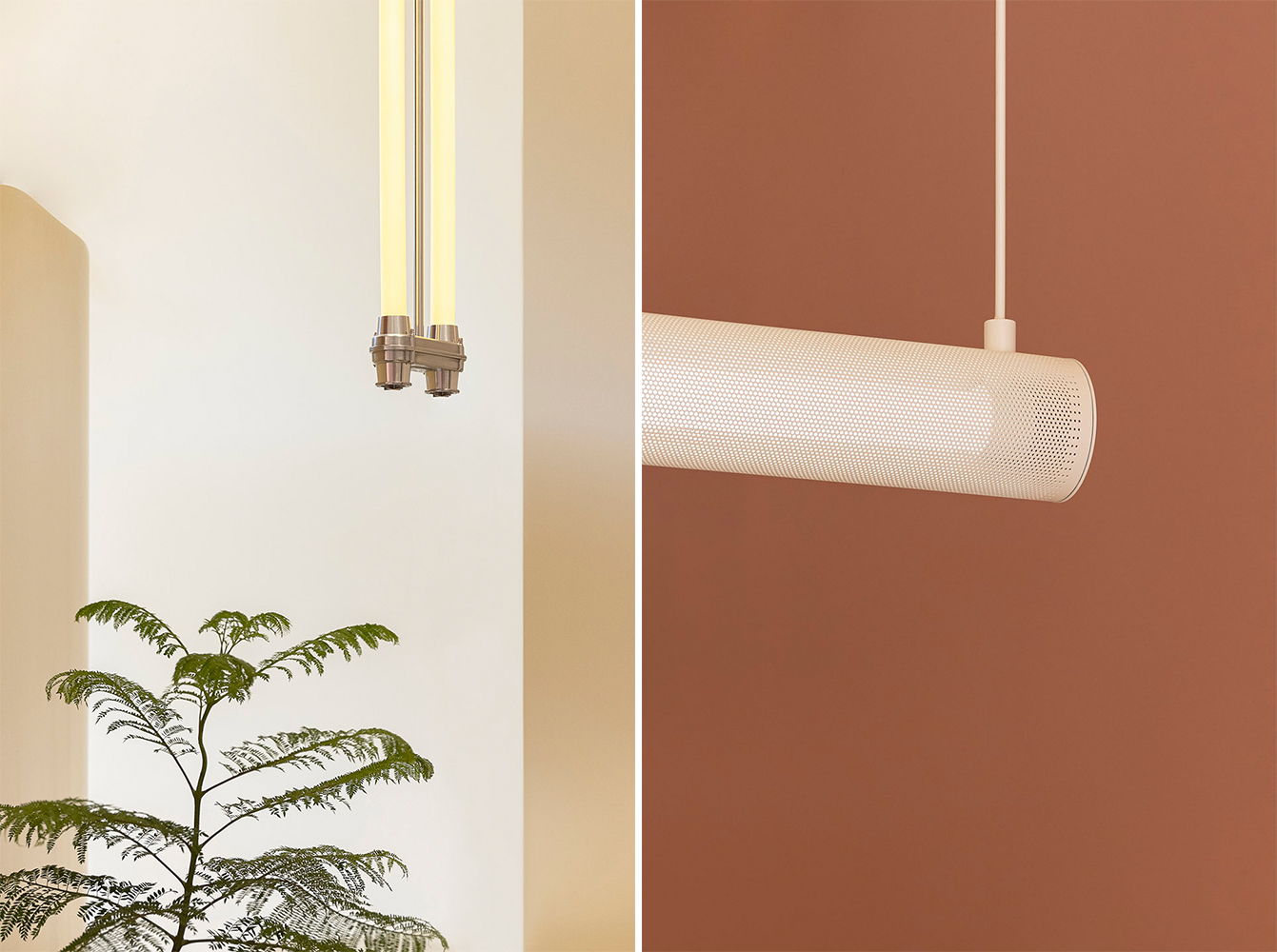 在11米超高挑空中,需要一款别致而夸张的灯具来搭配,我们选取了年轮公园(Zoring Park)出品的“漫游”双管荧光灯。这款灯具设计通过连接基础单元,可以实现自由组合与无限延展,进而体现空间的深邃。灯体形态受电影《2001太空漫游》发现者号飞行器启发,因而取名为“漫游”,意图激发受众对其排列组合及场景搭配的无穷探索。