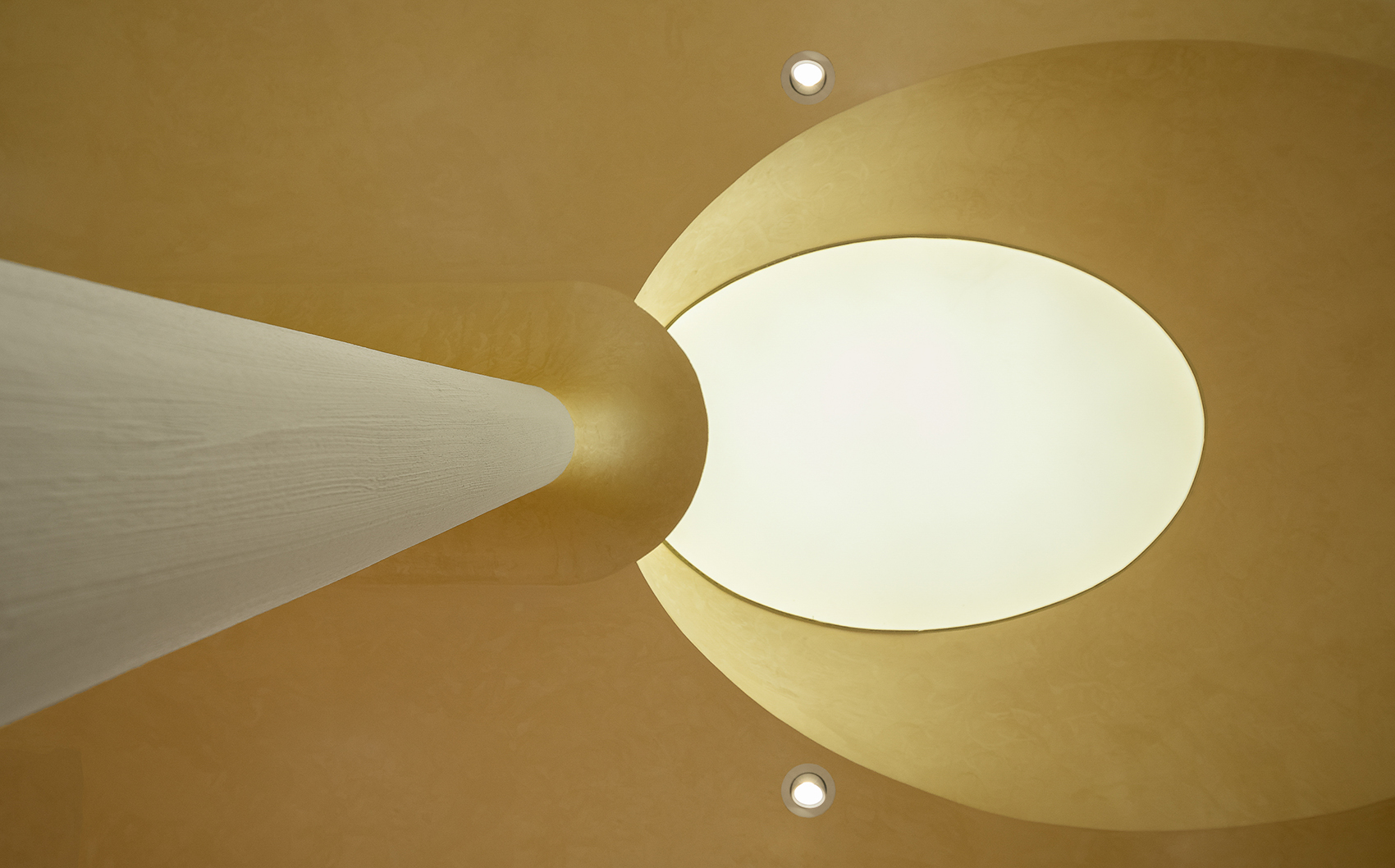 空间内饰不过分追求装饰性和复杂化,大面积选用了暖黄色的艺术涂料及手工刷制的白色乳胶漆,便是整个空间内部的主要材料。我们希望整个空间立面从构造和材质上尽可能的简单,让展陈成为空间立面唯一的焦点。