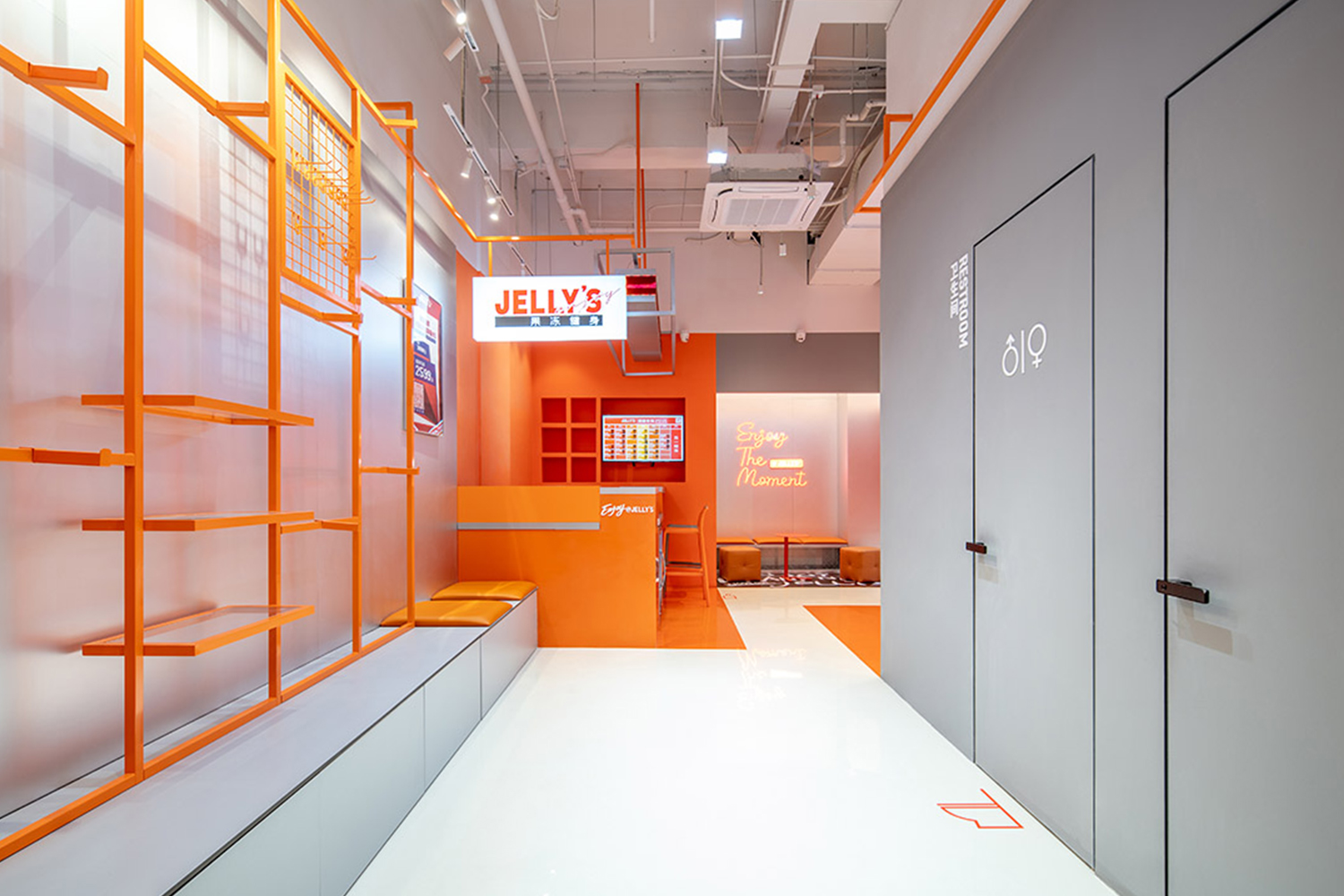 最初在为Jelly’s做品牌定位时确立了“友好、快乐、舒适” 的品牌人设,这次在设计中确定了“彩色与盒子,信息与连接”的主题策略。将其有效转化,运用至空间体系中。