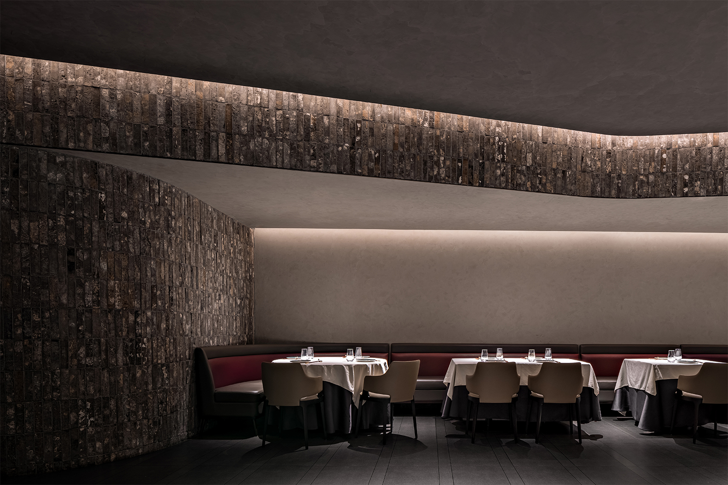 整个空间最北侧,粗粝条砖包覆整个墙面,又与天花相连,墙体结构回转蜿蜒,凹处设卡座,旋转开启处则恰好进入VIP包间,室内的建筑感在此处达到顶峰,无论餐桌烟火还是人文奇景都归于平静,只剩一个粗粝又丰盈的“大背景”。