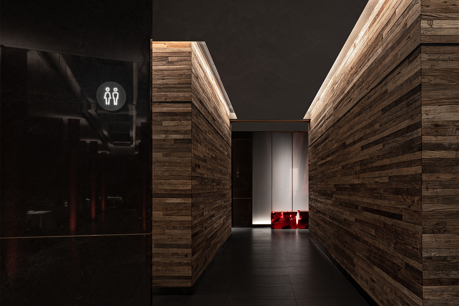 主入口北侧,卡座与圆桌排布更强调秩序感,朱红廊柱为素色空间点睛,金属网隔断隔而不绝,步入便有层层递进的仪式感,砖石颓墙在这里延续呼应,灯光悦目的酒窖点亮空间深处。对侧原始古朴的木质墙面通过材质转换顺势切换至另一功能区。