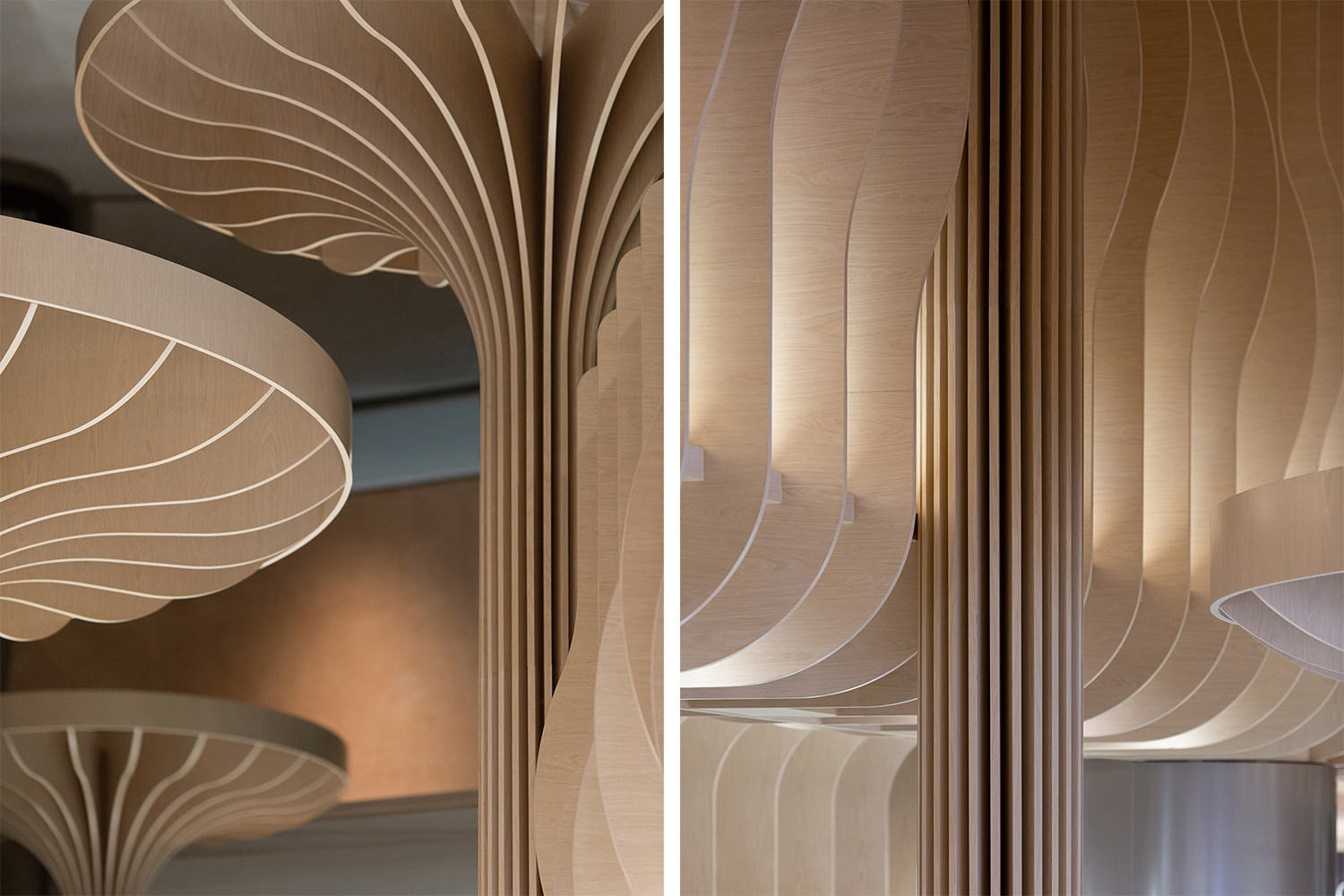“树”和天花板采用了优质原色橡木。“树”的结构由一系列鳍状木板组成,这些鳍状木板在顶部呈放射状分布,形成树冠般的顶棚装置。低层的“树”做了背面发光的设计,制造可以引导顾客的视觉焦点。