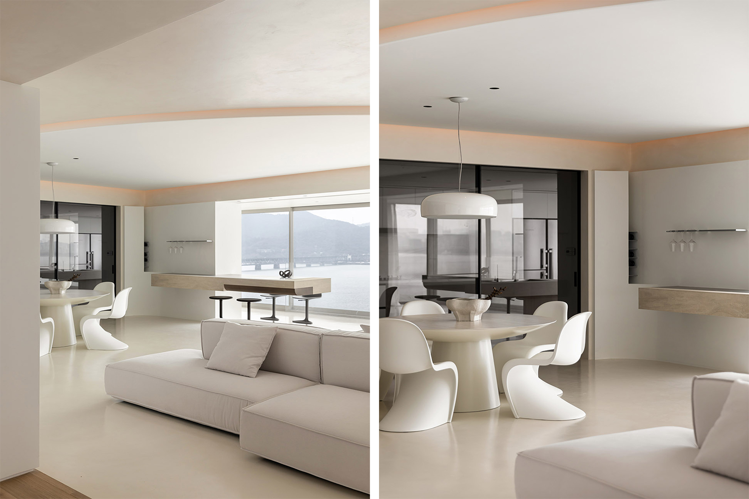 空间的“多与少”,微妙且直白。客餐厅开放式格局,行云流水的几何线条被折叠、翻转于空间中,模糊了区域边界和认知,构建出更多元的体验场景。没有隔栈堆叠,以沙发餐桌为重心的生活形态渐次向外自由延伸,光影流转间,满是生活哲意。