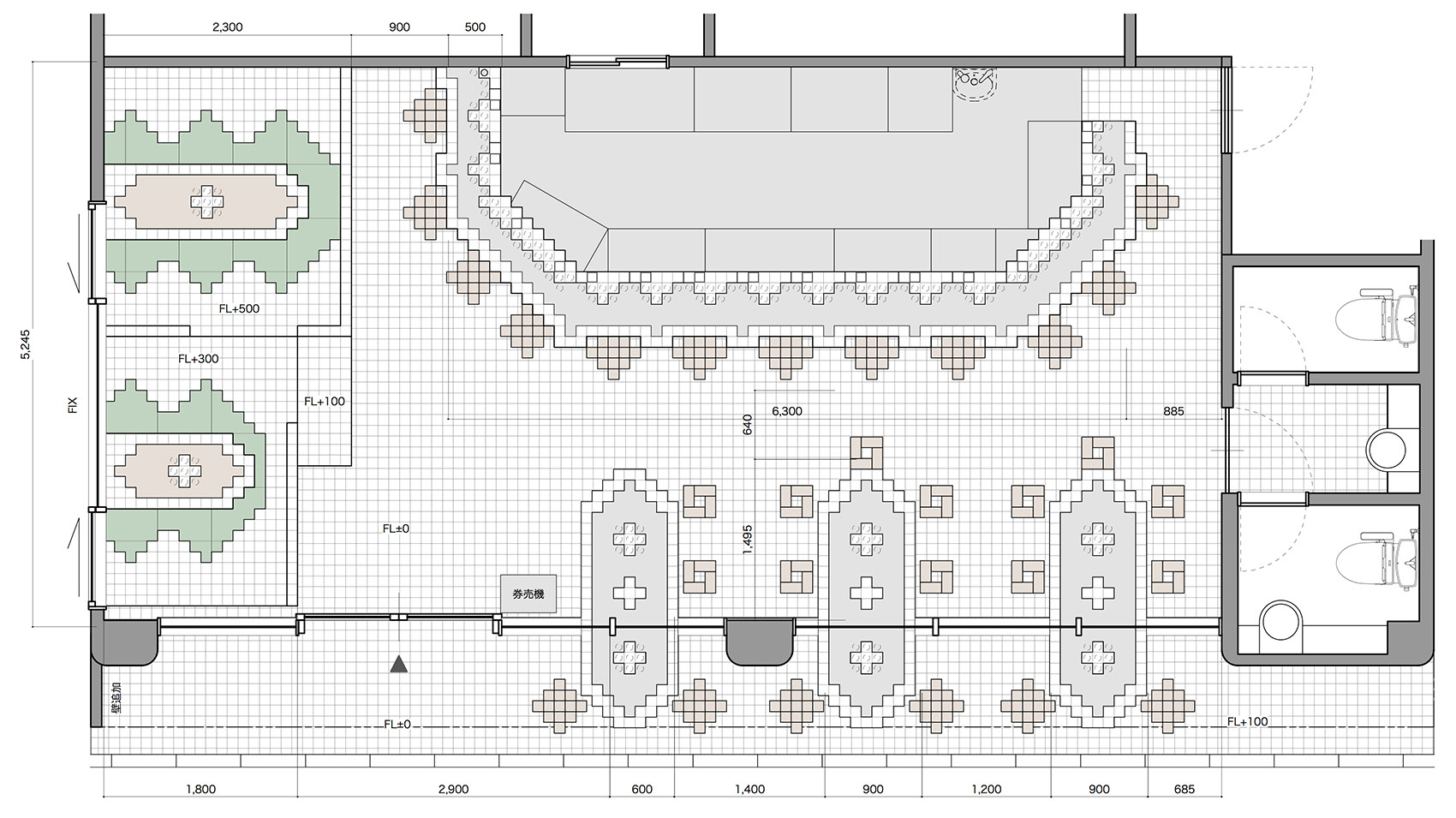 餐厅中选用常见且经济的白瓷砖、木材、水泥、方砖等材料。虽然以电子游戏为灵感听起来有些陈词滥调,但设计却通过材料的组合和独特的造型打造出独一无二的空间。