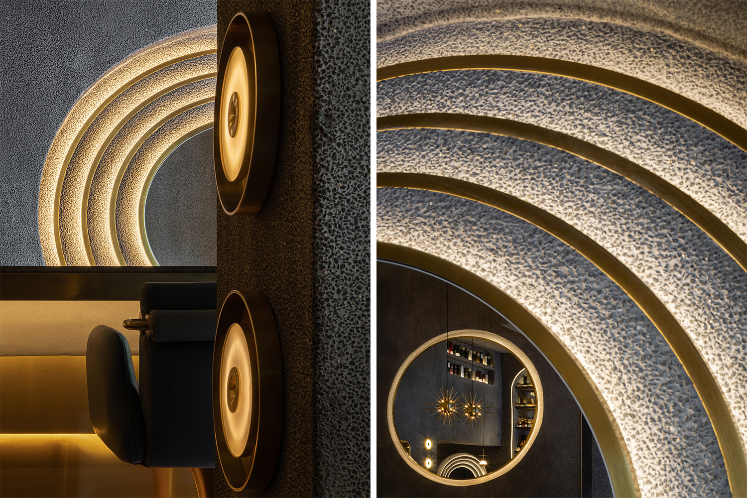 一百平米的二层空间,则选择带有灰调的紫红色系,以更精致而神秘的场景韵味满足高粘性客户偏私属定制的产品和服务需求。圆环状的流线型语汇从天花照明延续至包裹感造型的座椅组合,皮革与黄铜裹挟浸染时光的工业复古基调,横纵之间嵌入式的序列镜面圆洞又与之构成极具舞台张力的超前审美体验。