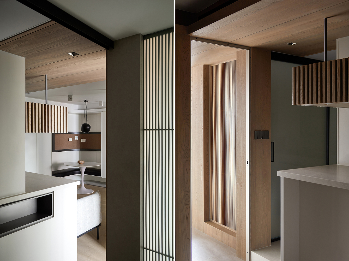 平面阶段和屋主沟通定下了马桶移位的平面方案,经过与马桶厂家和施工团队的多次沟通,最终我们借用部分次卧空间,将马桶区和淋浴区移到了合适的位置。干区则安排在开放厨房的一侧,完美实现了干湿分离。整个室内的平面规划之所以能够成立,得益于马桶移位问题得到完美解决。原始房屋老旧,排污和排水公用一个侧排的铸铁管道,所以原洗手间是被抬高的,随便移动极易造成拥堵。后来设计师想到使用办公空间常用的粉碎式马桶,反复确认可行性之后,施工团队完美落地了公共区域最开阔的一版设计,最终成就了这个开阔舒适的家。淋浴房使用玻璃移门,不占用空间,也能给卫生间带来光线。靠近次卧的一侧也安装了一整面玻璃墙,用木格栅做饰面,既能保护隐私,也能带来很有韵律的光线,提升空间的气质美感。靠近次卧的一侧也安装了一整面玻璃墙,用木格栅做饰面,既能保护隐私,也能带来很有韵律的光线,提升空间的气质美感。