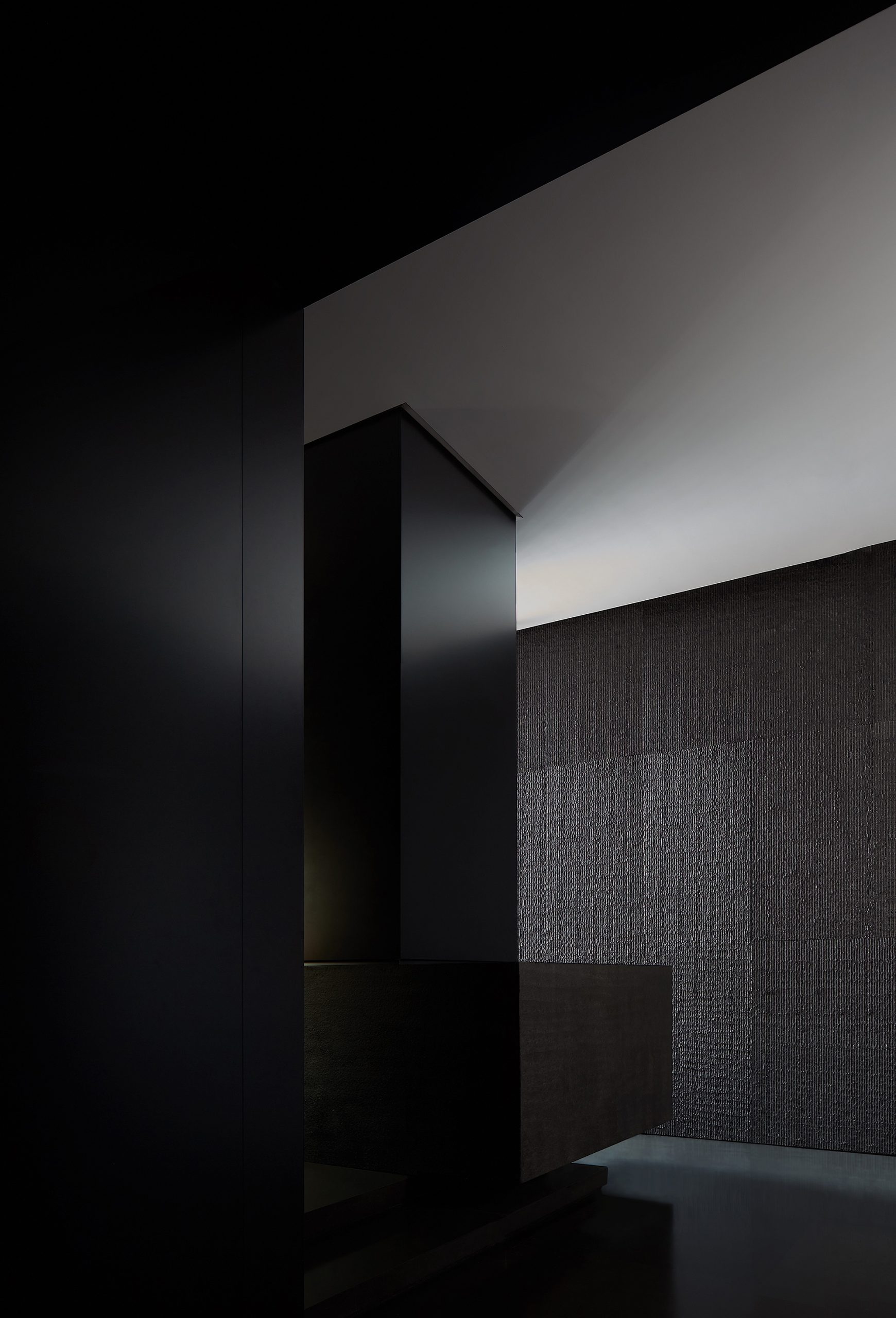 门廊处以大块面纯粹的用材与用色铺就,硬朗凌厉的勾勒出酷黑基底。立面则贯彻极简与解构概念,引入框景、造景及构成语言,并谨慎把控内外界的衔接尺度,造就高辨识度的个性形象,恰如“屏”的形式,滤掉周遭喧嚣,欲拒还迎,邀人入内。