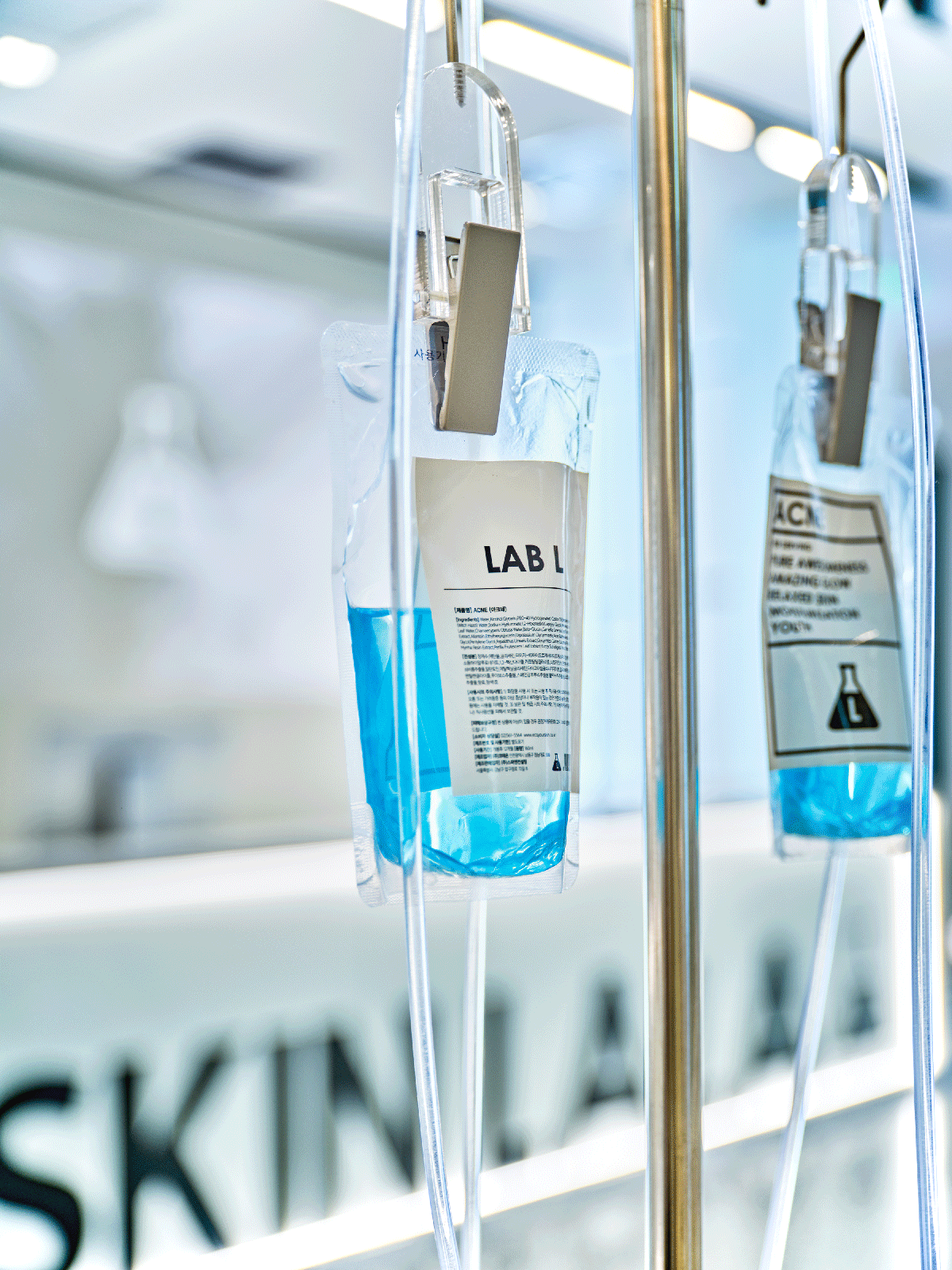 局部空间通过玻璃砖、玻璃材质,满足完整区域划分及合理动线的同时,引入光线,令小空间不局促,并使得内外关系更具互动性。同时在产品陈列上,品牌深耕研究的技术结晶也被完整展现,通过输液袋,针剂等科学医疗的形式凸显品牌差异化。这也是SKINLALA最大的特色之一,为每个人个性化定制,现场调配最有针对性的肌肤唤醒方案。