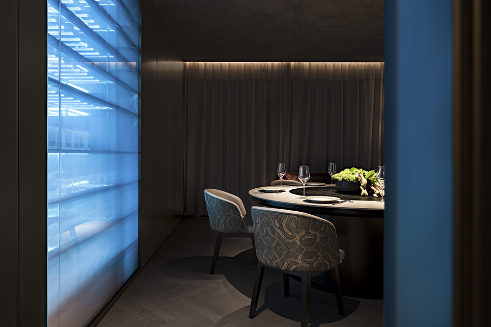 幻彩灯光漫上夹道两侧砖石和酒窖玻璃,视线尽头是浮动灯光里的水吧一隅,一个T型门厅走道给出了空间内两条主要动线也将食客带向不同场景。设计师利用环形水吧定义让食客动线连贯流动起来,同时清晰明了地区分了视野绝佳的开敞散座区和隐在餐厅后侧的独立包房。