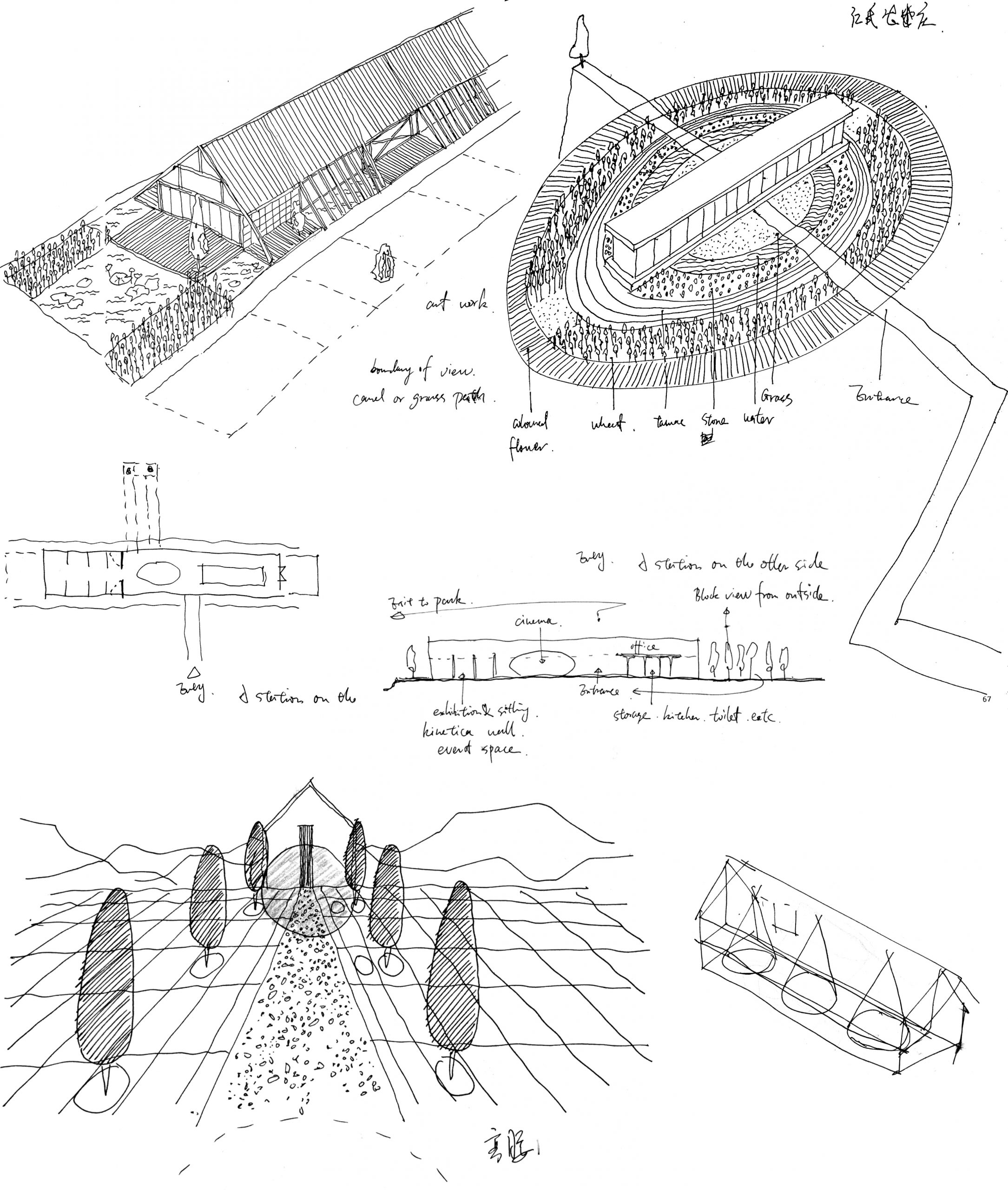 农副产品小超市与文创小商店作为配套的商业功能与美术馆主体建筑直接分离,在高粱地里以两个独立圆形平面的点状空间呈现,既从建筑体量上明确功能属性的不同,又有意识的将人们的行为活动从建筑内部拉到高粱地中,室内外频繁切换,回归自然。两个商店一个内部抬高 60 公分,营造轻松自由的平面,另一个抬高后又降低,营造沉入大地的氛围。