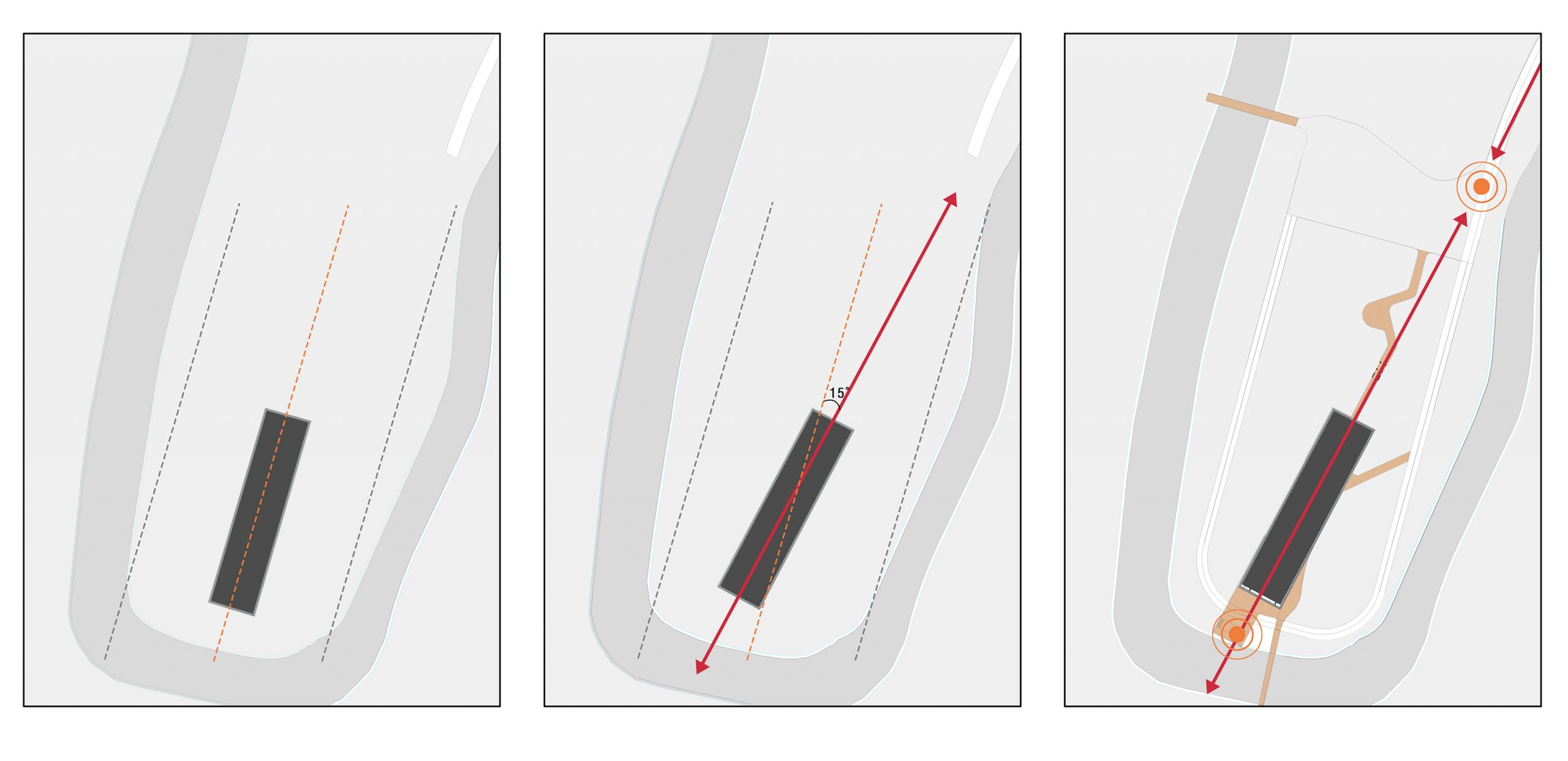 线性的空间形态顺应长条状半岛的环境关系,兼顾农庄研究人员的日常使用与参观人群通行的作用,在半岛轴线的基础之上顺时针旋转 15 度,既使建筑山墙面正对车行入口,创造更好的展示效果,又让建筑出口避开现有步行桥面对回水塆,创造一个亲水平台作为节奏变化的空间节点。