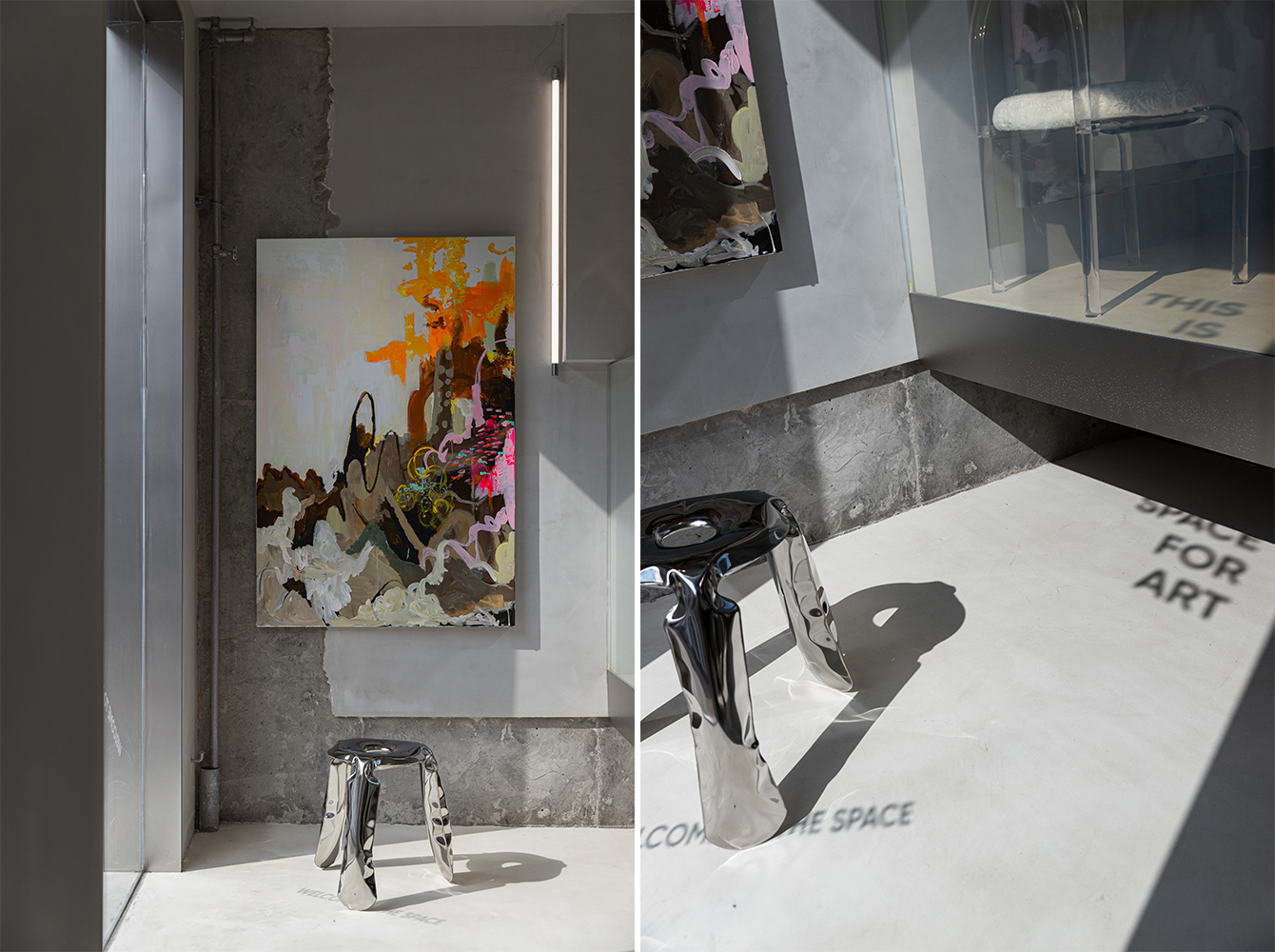 考虑空间中需承载艺术策展等功能,设计中保持了钢筋水泥的建构原态,将并预留了大面积灰白纯色,此时细节材质与灯光配合便显得尤为重要。大量金属、通透材质、微水泥及原墙结构衍生空间感受中的对立关系,并形成视觉冲击,给予画作、摄影等相关艺术作品展示,为空间预留更多可能性。