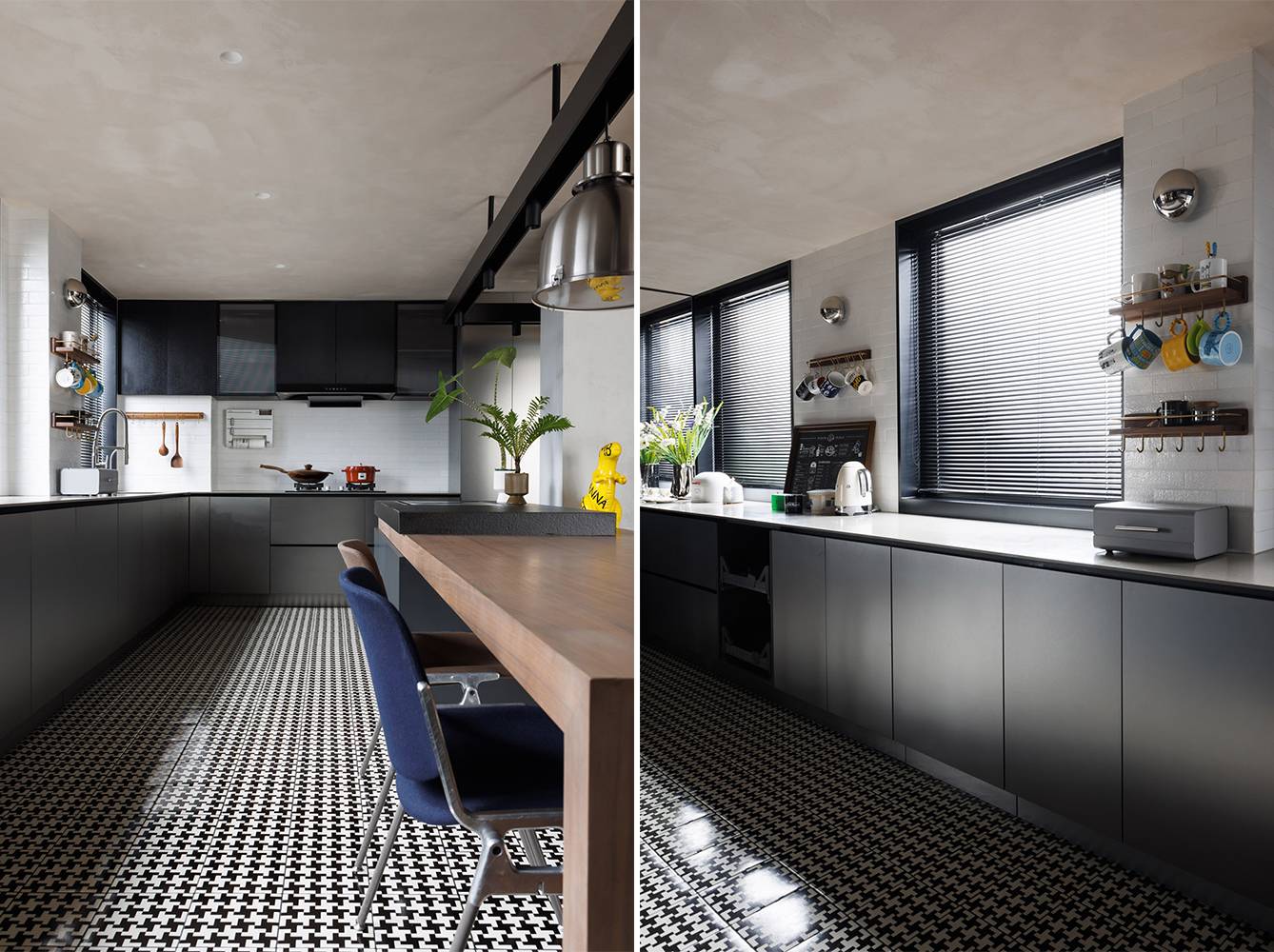 打开后的厨房,形成一个6米长的操作台面,标准厨电预留水电位嵌入橱柜。常用的厨电则首选好看的,直接一字排开,不影响采光的同时,也给空间带来一些生活美学的享受。千鸟格纹的花砖,低调又浪漫,作为南洋风的灵魂,给空间带来的时尚复古感,使空间更加灵动。