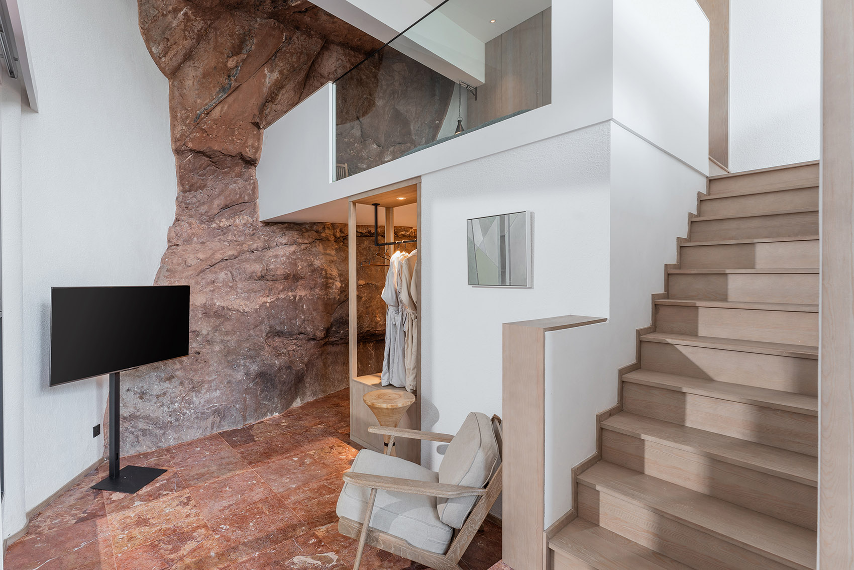 客房区域自然的洞穴岩壁与现代建筑的对话,两者协调的融合在一起,打破千篇一律的建筑感觉,融入凹凸不平富有肌理感的触感,形成了一个围合的空间,让体验者能和岩石有一个亲密独特的接触,当其置身于整个空间中,会迫不及待的探索空间的角角落落。