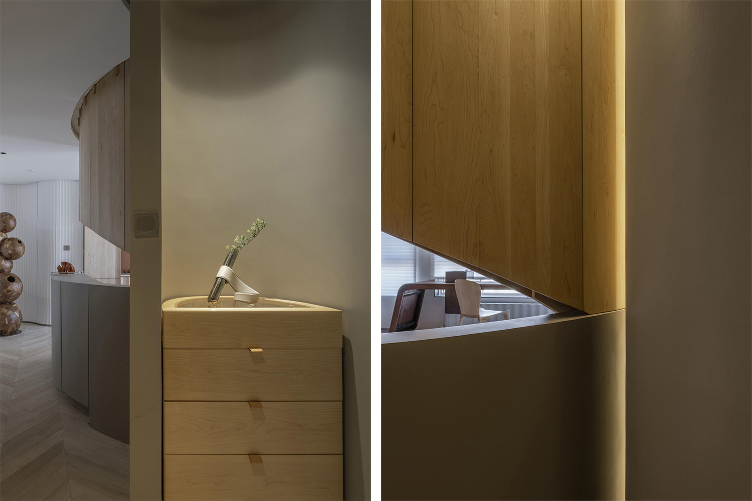 空间中只卫生间使用了封闭的门,其他空间均未有封闭的门,致使各个空间之间形成互相的渗透。除了功能上的集合以外,曲面墙的弧线走向还很好地起到了空间之间过渡的视觉引导作用。曲线墙本身既作为空间的分割边界,同时也是空间中的一部分。