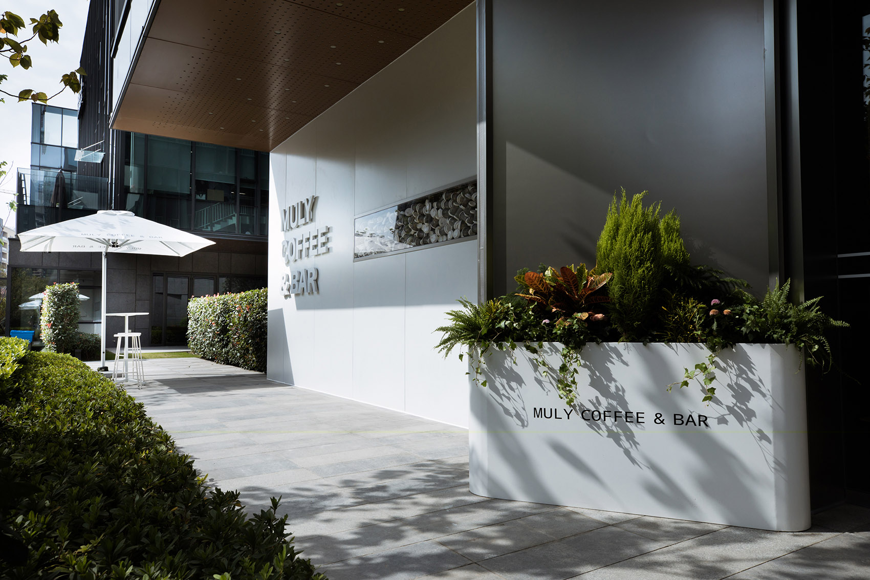 设计项目地处上海浦东新区,位于一座高端办公楼一层。不同于普通商业街道用封闭幕墙隔绝室内外空间的沉闷布局,项目沿街生动、开放的形态,让街道成为人与人发生交流的场所,形成有“厚度”与“温度”的城市界面。这家精品咖啡店以拥抱的姿态面向公众开放,让MULY化身为一道亮丽的风景线。