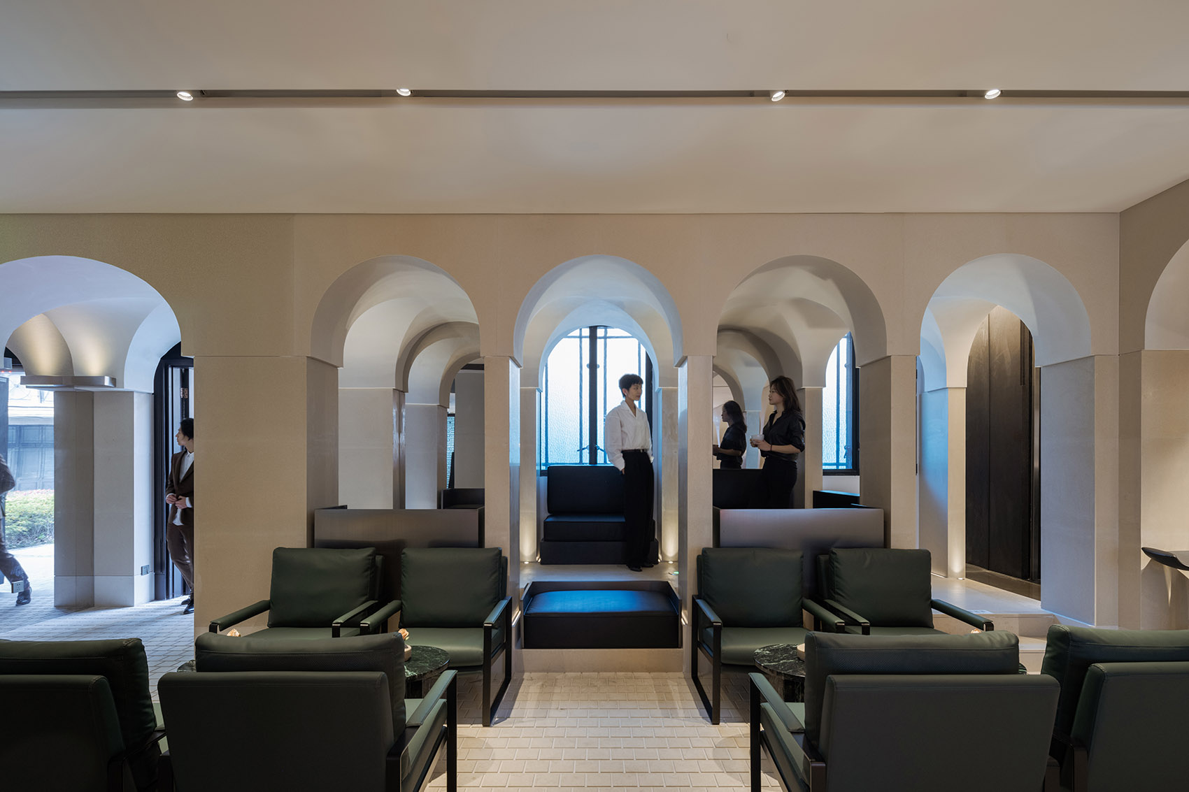 顾客从黄陂南路过街楼进入,原先需要从咖啡馆和公共卫生间公用的前厅抵达咖啡馆,我们决定拆除三扇玻璃门,把前厅变成灰空间,一个呼应室内广场柱廊的外廊。由此推开大门上几步进入被称为博物馆的咖啡馆吧台区。黑色的吧台区是刀把的把手部分,服务空间占去主要面积。我们把过道变成展览区和散座。大门的一侧是是用绿色手工砖打造的一个外卖等候区,同时也是一个和上海历史博物馆合作的小型画廊,你会惊喜地看到外卖咖啡会从一个暗藏的画框中递出来。