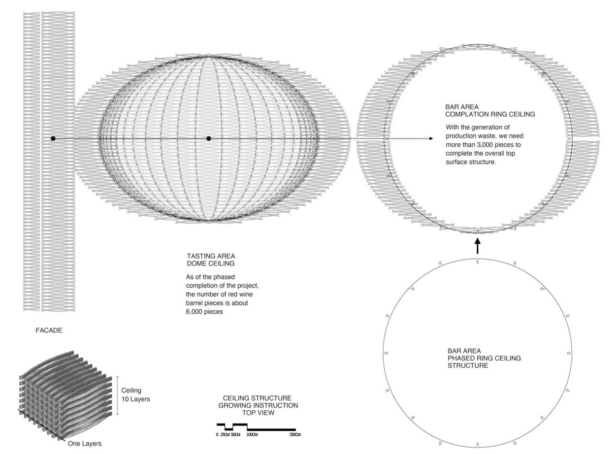 崃州蒸馏厂在建筑建成后荣获中国“绿色建筑”设计标识三星的最高认证,并且持续坚持着对建筑、生产、和副资源回收三个方面的环保落实。所以,在材料的应用上,我们秉持酒厂可持续的理念,利用酒厂废弃的橡木桶片和酒桶金属环作为整体最重要的构造材料,形成了崃州吧独一无二的室内顶面结构以及外立面。每一片被拆掉的木桶片在木片弯曲弧度、宽度、长度和纹路上均不同。通过每片不同的尺寸细节和纹路,我们把其进行分类应用到外立面和穹顶不同的位置中。我们很清楚的知道,废弃的橡木桶数量是有限制的,在这个前提之下,评估整体酒吧的形象设计,针对双环结构的双穹顶,我们决定如同筑巢般,先筑出品鉴区的穹顶,而后伴随着时间的增长而产生的废弃木桶片,再一步步积累朝向酒吧区的穹顶做构筑。而酒吧区的顶面金属结构为下一步木结构的增加做好了现场的结构基础。