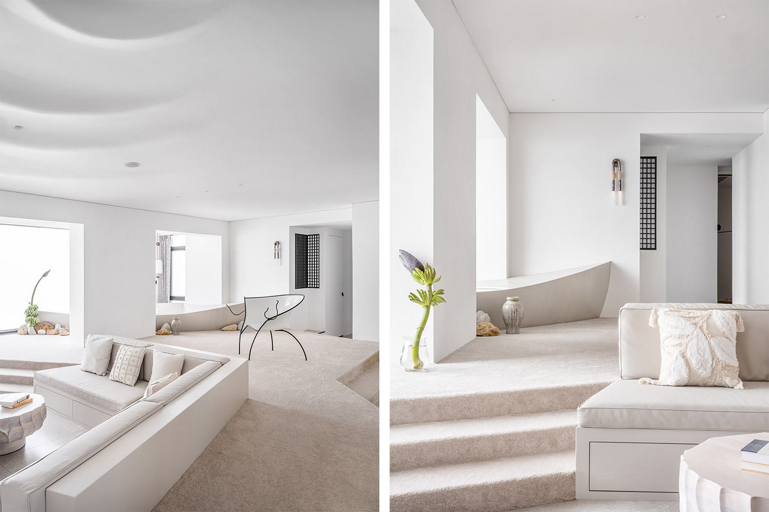设计过程中尝试让材料发挥它们的温度属性以此来描写空间的精神隐喻:瓷砖温度如同大海般沁凉,松软的地毯像是被太阳烤过的沙滩。赤脚去感受“海水”与“沙子”两种反差质感带来的心灵抚慰, 在“沙滩”上留下生活的足迹。墙面采用定制砂岩艺术漆,阳光下白色沙石墙面闪耀出矿石晶体,仿佛像外墙材料一样,让人产生一种在户外的错觉。整个项目通过从自然环境到室内空间和家具的思考,传达出设计对生活方式的塑造力,以及突破传统住宅模式的创造力。