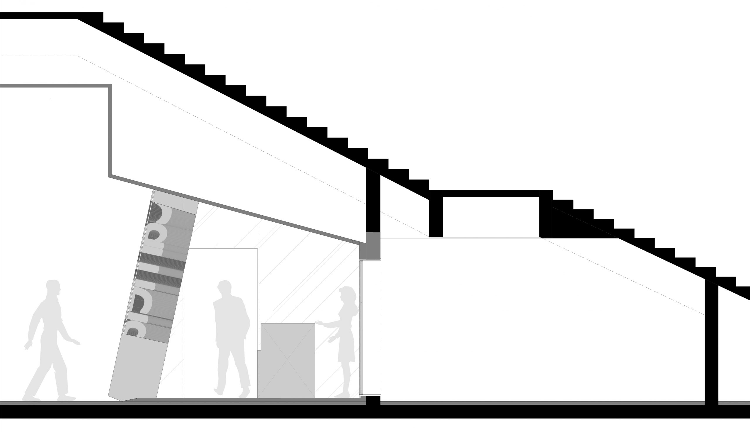 蛋糕店的所有功能被整合在两个L形体块上:一方面,它们在垂直方向上“托住”大台阶,其中一个甚至刻意倾斜成与台阶底面垂直的角度,在视觉上制造强烈的受力关系;另一方面,它们横向展开为台面,充分占据长方形平面的两个长边,并形成从侧面进入、横穿而过的内部流线,与圆形下沉广场的环形流线融为一体。