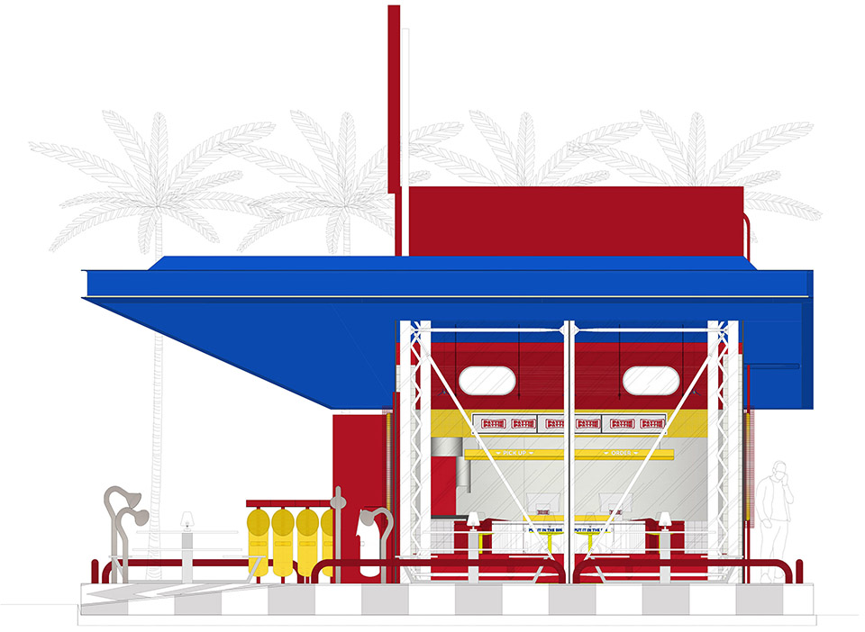 天花板后部没有设置任何建筑设备,以保证悬臂天篷能够以最薄的尺度贯彻整个建筑的室内外空间。管道的设计旨在突显出这些设备的存在感,经激光切割穿孔的拉丝铝板取代了标准的挂网将管道设备整合在一起,并且成为了餐厅中独特的空间装饰元素。外摆区地面采用了两种类型的花岗岩,这种材料不仅具有良好的耐磨性与耐久性,同时也以独特的美感与带有工业风格且色彩鲜艳的建筑相辅相成。