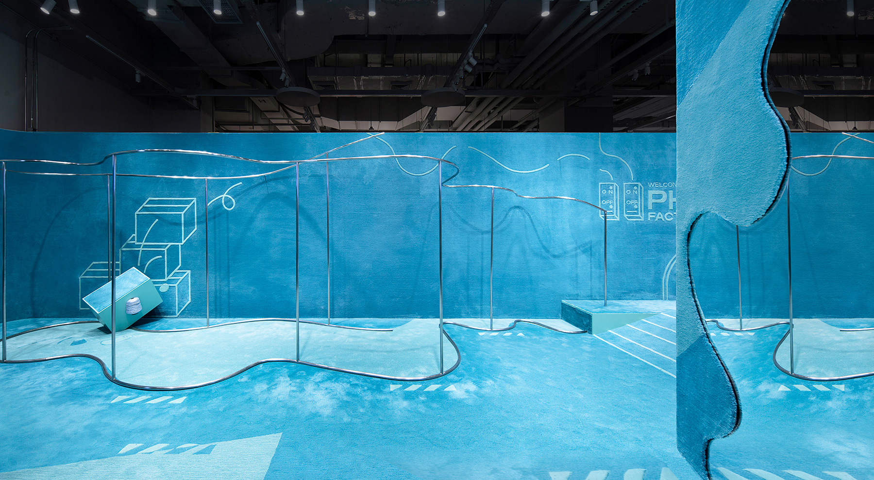 PH5标志性的曲线成为空间的主角,占主导地位的曲线衣架与墙面上的曲线交织映射。 空间设计语言混合了二维和三维,共同描绘针织厂的有趣时刻和片段。 例如一箱线卷儿从一堆箱子上坠落;一台针织机正在织完一件PH5的衣服;针织厂弯曲的管子溢出一滩水,化为一面边缘弯曲的镜子;两个窗户形状的灯箱让阳光照射进来,在墙上和地板上变成二维图案。