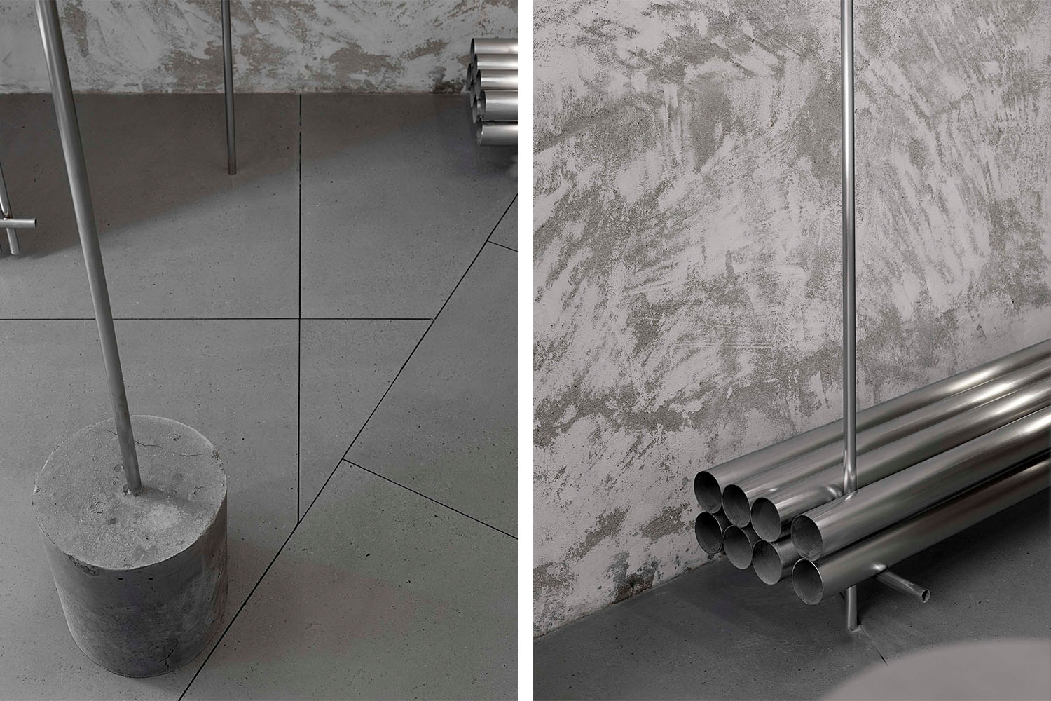 线构成了空间内的装置和功能,我们使用不锈钢圆管打造空间内全部功能体系,通过交错与叠加,形成不同陈列属性的平面,与地面错落的体块切割线条,创造出多样的光影角度。