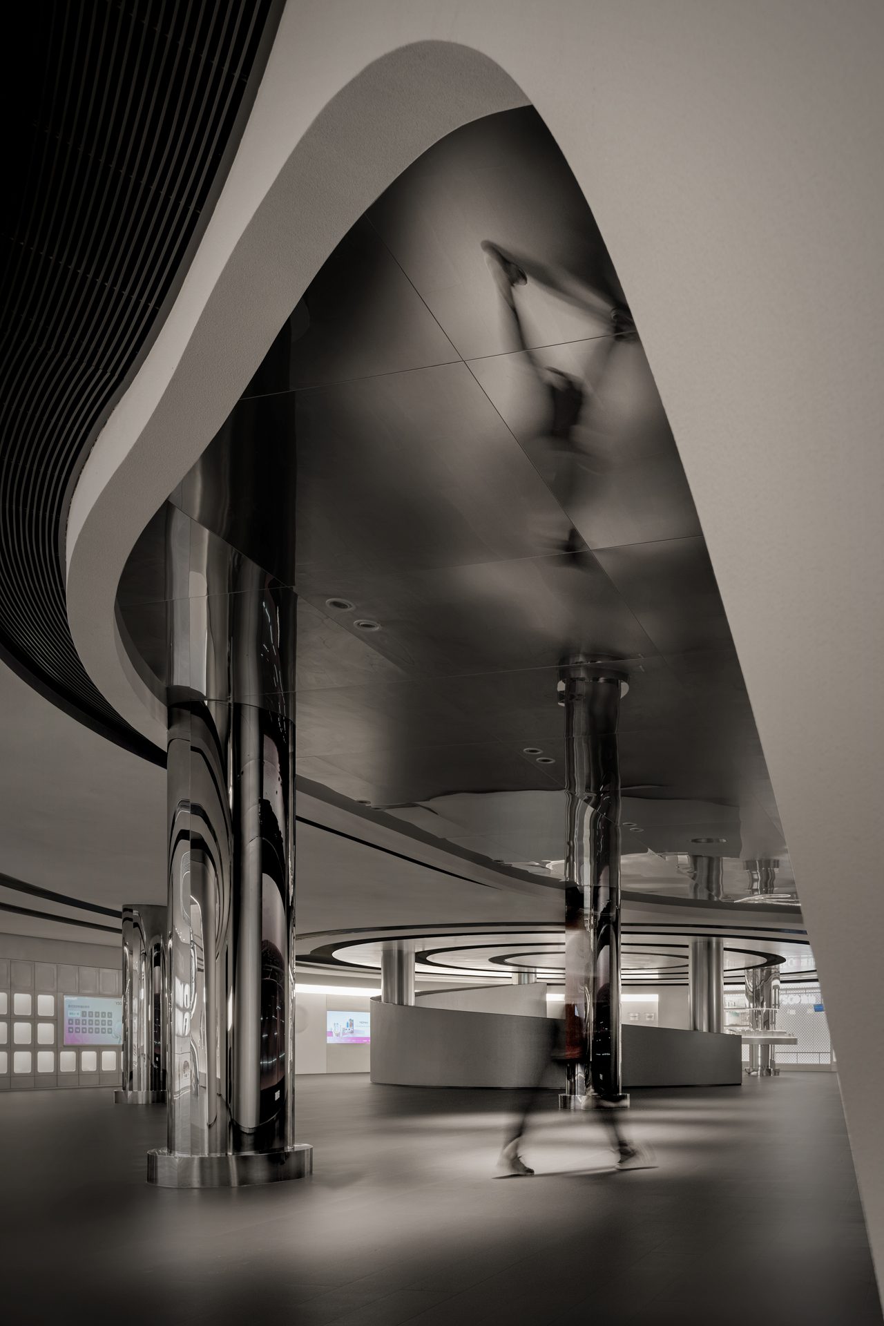 随着天地线条造型的引导,来到企业介绍展项,以装置墙的设计展示重要里程事件,并以曲面斜坡造型展示企业信息,融合而不失庄重。四大核心区域墙面利用弧形墙体造型形成了半通透状态,有效地降低了空间的视觉阻挡,保持整体空间通透感且分区明确。