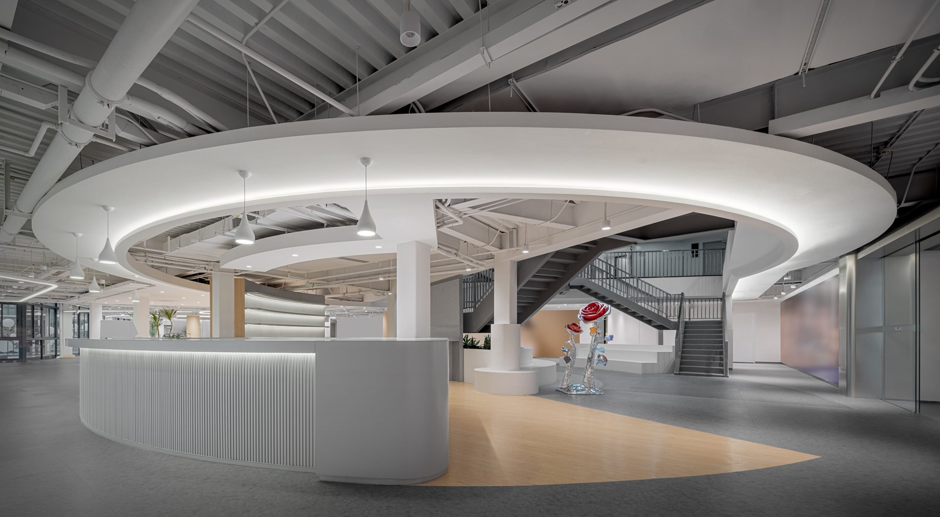 未来研发区域采用独立的柱身做成具有视觉冲击力的精品展示台,背部墙面采用了环形发光展示台,用精致的的方式呈现企业研发成果,亦可作为品牌直播空间。