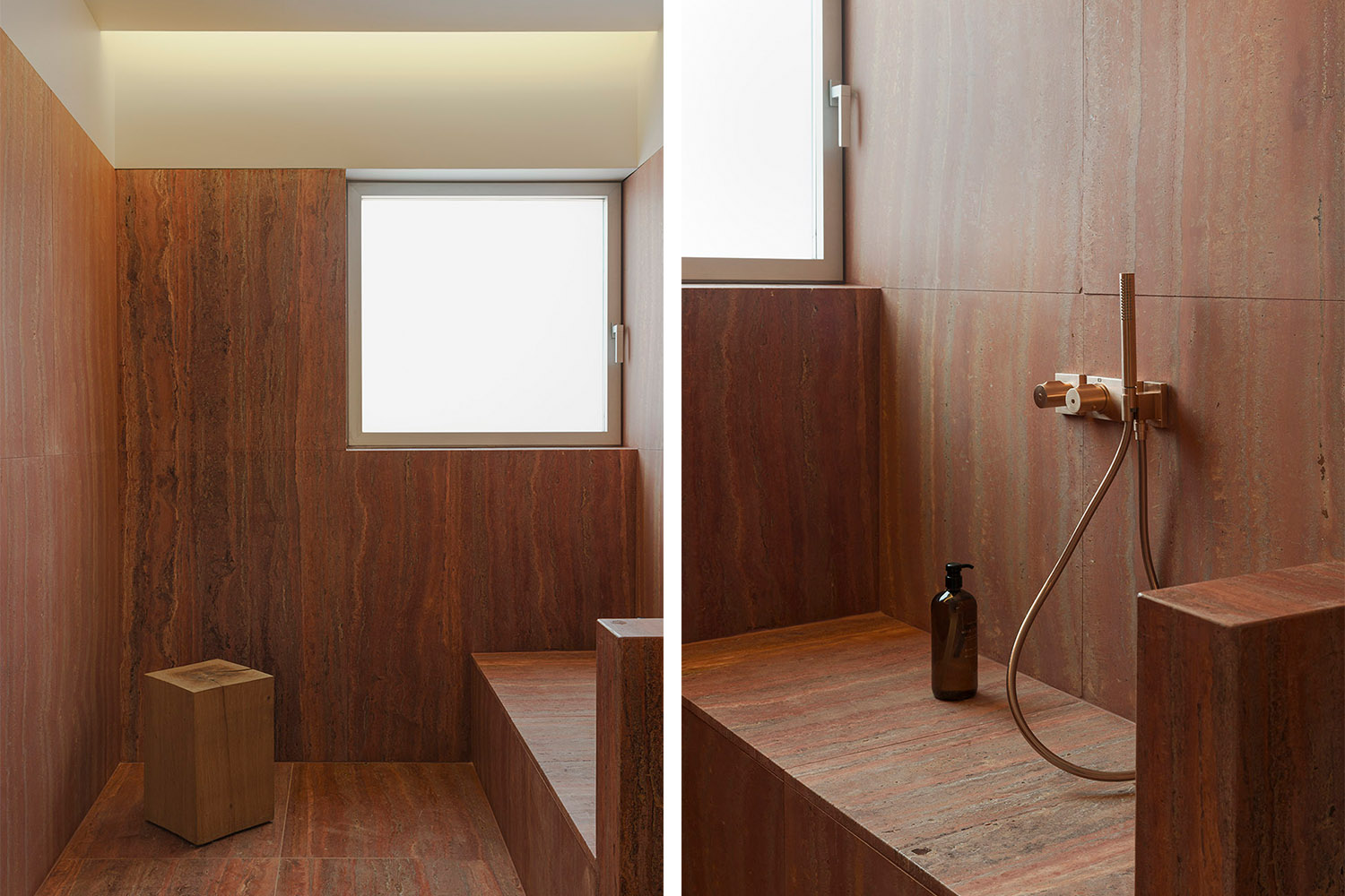 该项目的独特性也体现在材料、色彩和纹理上。陶土色调占据了地面和外墙的大部分,让建筑与环境更好地融合在一起。异国情调的大理石(如伊朗洞石)、黄铜、橄榄绿木制家具和水景相互映衬,为空间注入了独特的氛围。