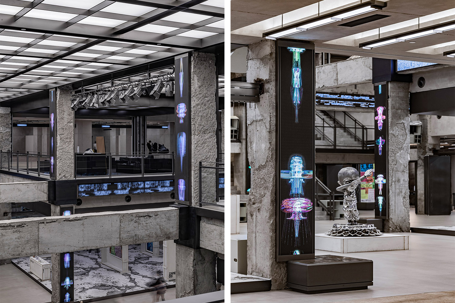INNERCO是COSMO最大的亮点空间,占据了二、三楼共7600m²的空间。该区域保留了裸露的混凝土建筑结构,融合现代设计元素,与LED幻彩天幕的结合形成了一种历史性与未来感的碰撞。