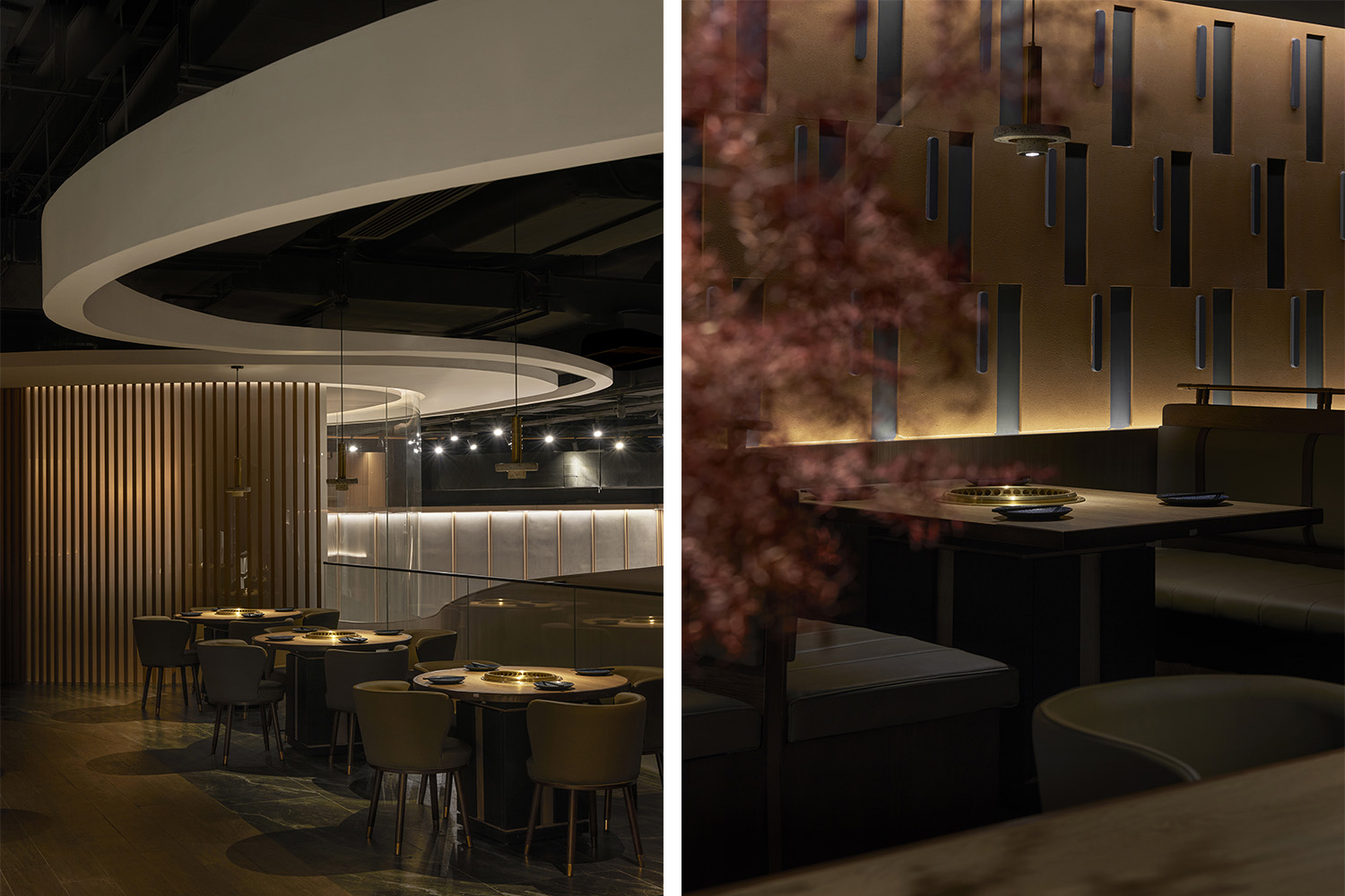 整体区域一层在开阔中错落有致地排布餐位,善用光影,为不同的功能区块特别设置了不同的光影氛围,将空间利用率和就餐体验达至平衡。串联空间一层和二层的楼梯嵌入背光灯柔化空间的硬朗感,整体线条写意勾勒,刚与柔、明与暗、方正与流线并举,也让大气的餐饮空间定格了一抹灵动生机。
