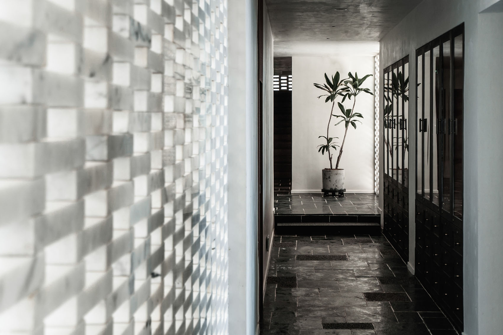 推敲、选用材料的过程,也是设计师不断梳理设计思路的过程。在云七,设计师秉承“选择材料的过程中带着自然属性,在施工过程带着人工属性”的理念,尽可能使用自然材料抵达天然质感,石材、砖、涂料,有着未经人工雕饰的拙朴质感,而在施工时,则不会刻意追求过于精致的美,将匠人们雕琢的痕迹保留下来,空间不再是一个冰冷的存在,而是和人一样拥有呼吸感,存蓄着一时一地的生命力。