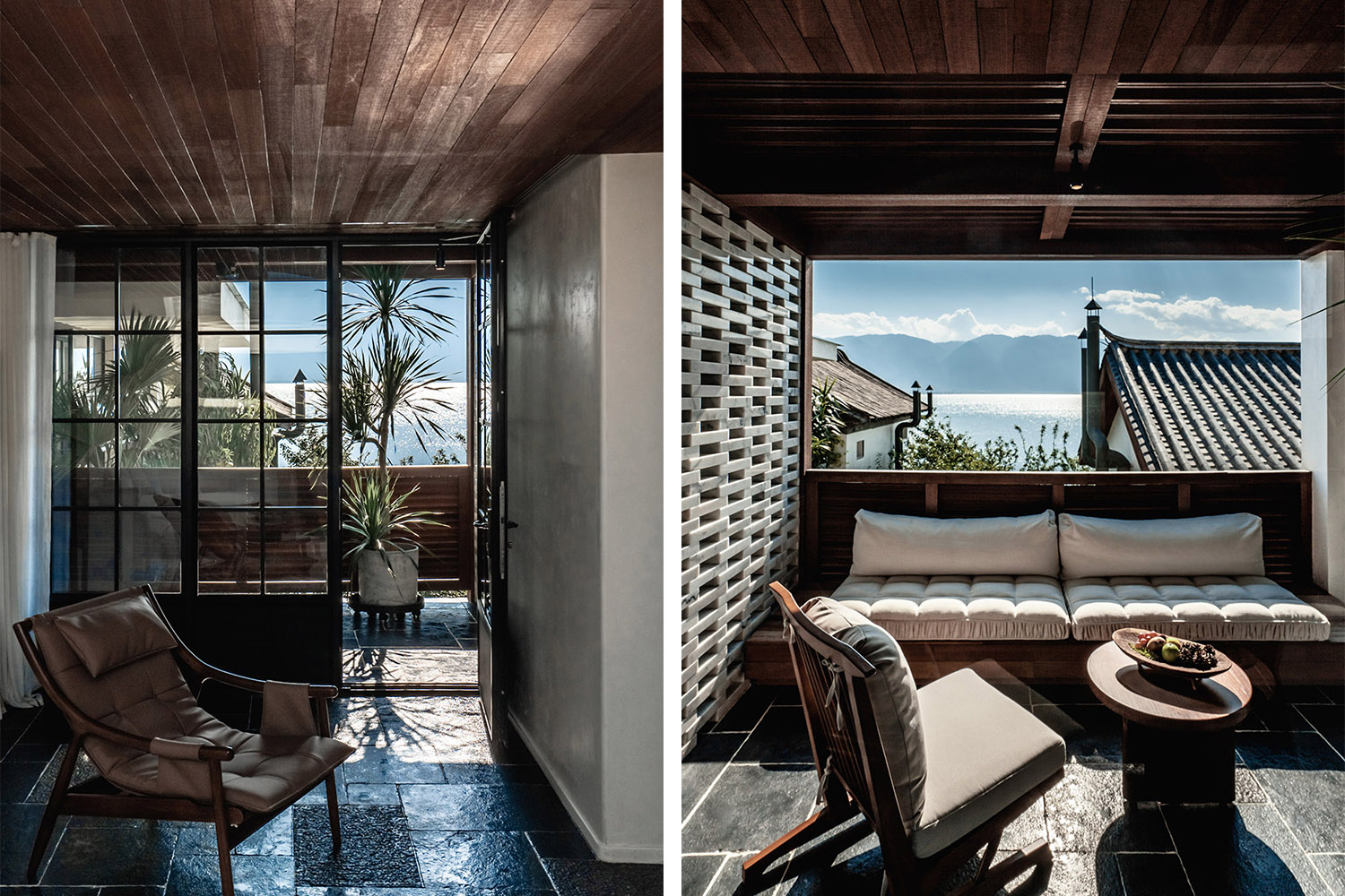 试想在此度过悠然一天,伴着洱海的朝阳与鸟鸣从睡梦中醒来,就着窗外波光与昂然绿意用餐,窝在沙发看海、发呆,亦可彻底放松,在躺椅上迎来夕阳,日落之后回归房间的深处,饮一杯红酒,看火光在壁炉里尽情跳动……空间接纳着各种可能性,帮助居住其中的人们以不同的方式感受洱海苍山,寻找属于自我的度假时光。