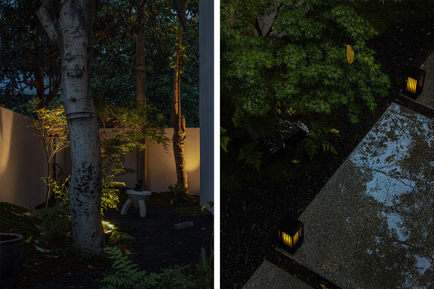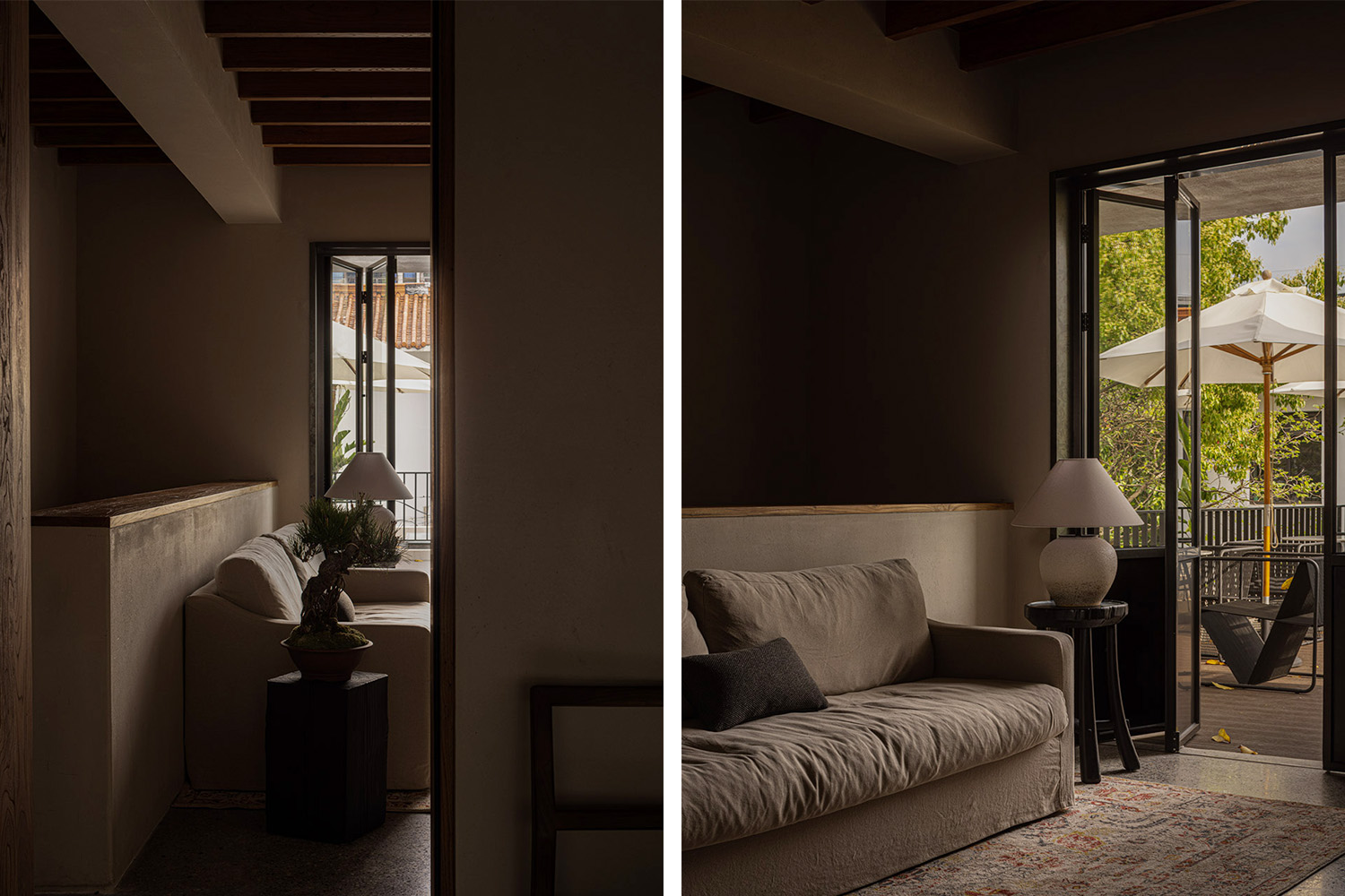 侘寂之美,得益于“苔痕上阶绿,草色入帘青”的布景,以至“花将色不染。水与心俱闲”的悠然心境。空间孕育的纯粹意境,藏驻在朴拙的自然力量中,绿色剪影映于石板之上,好似消磨岁月一同停留,万籁此都寂,一切纷扰被隔离在外,这便是短暂安置心灵的“世外桃源”。