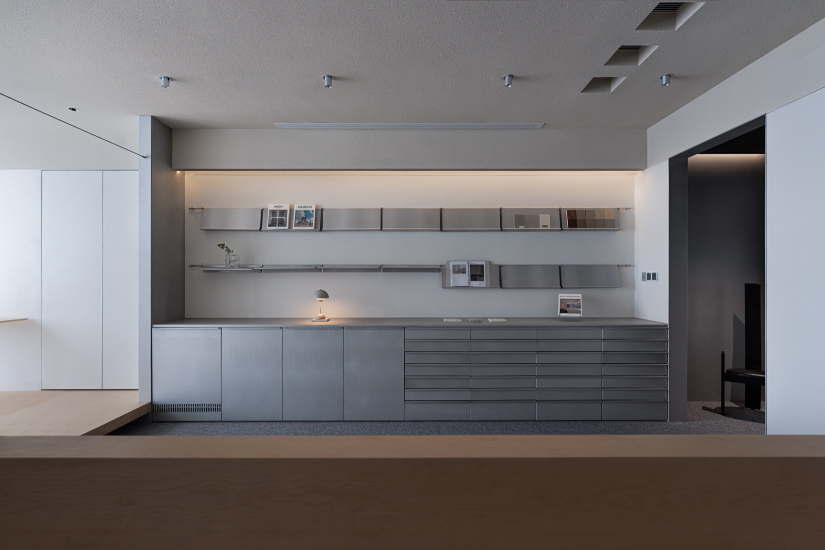 我们在此区域做了功能的叠加,材料展示柜/展架、茶水台、沙发区、观影区。与办公区分割处增加了一个顶部与吊灯结构上的视觉落点,通过半围合的形式,结合功能与灯具和顶部造型的结构穿插,希望空间的垂直尺度向上延申,吊挂系统的加入不仅链接了各个区域,增加的悬挂功能,海报、手稿以及植物都将是吊挂的常客,添了分空间趣味。
