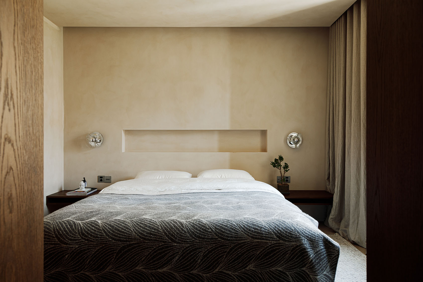 公寓本身的另外两室被改造成了卧室和衣帽间,位于玄关的另一侧,与生活区分开,更为私密安静。卧室选择了没有床头板的床具,只在墙面上做了造型极简的壁龛,搭配内置灯带,既是很有氛围感的装饰,又兼具一定的置物功能。卧室上方的吊顶中也隐藏了灯带,开启时两道光晕交相呼应,在墙壁上留下有趣的光影。床头两侧,是业主淘来的Peill&Putzler波浪壁灯,同样是来自上世纪70年代的中古作品。墙面上是业主在拍卖会上拍得的心爱之作——近代著名画家常玉的作品。画作的暖黄色调使卧室和客厅拥有同样的配色。