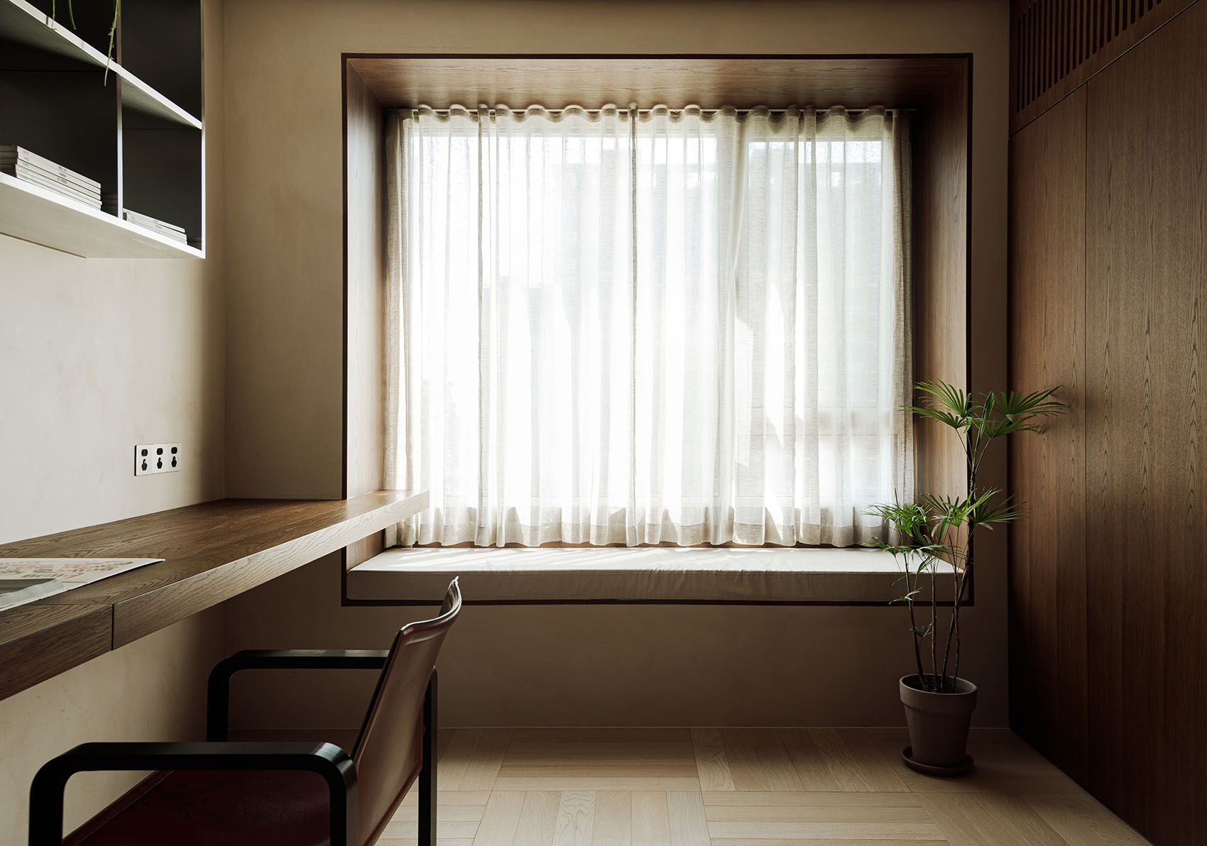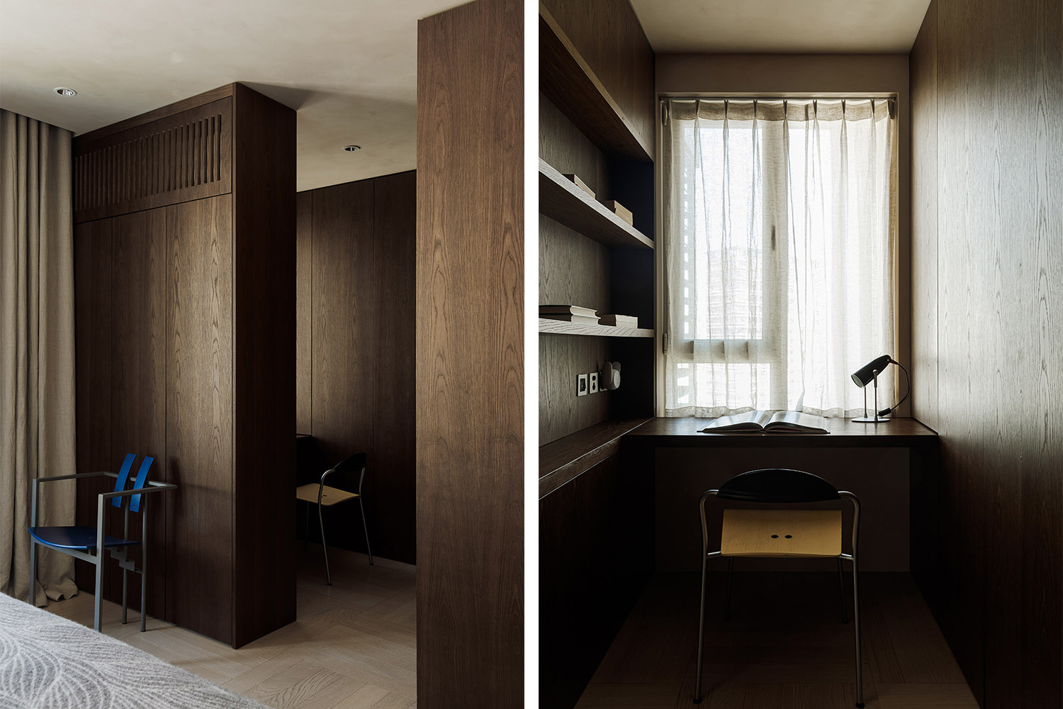 在其他空间中出现的不锈钢元素也延续到了书房。书桌上方,一个开放式不锈钢搁架居于中央,可以收纳、陈列很多物品,展示的同时也补足了书桌区的收纳功能。“书房空间应该是安静的、沉稳的,让人能体会到沉浸感的空间,”设计师阐述到,“所以我在这里使用了尽可能多的木色来装饰。”书架、书桌、收纳柜、口袋门都使用了统一的橡木饰面,连飘窗的窗套都定制成了同款木材质,让整个书房显得温润沉静。