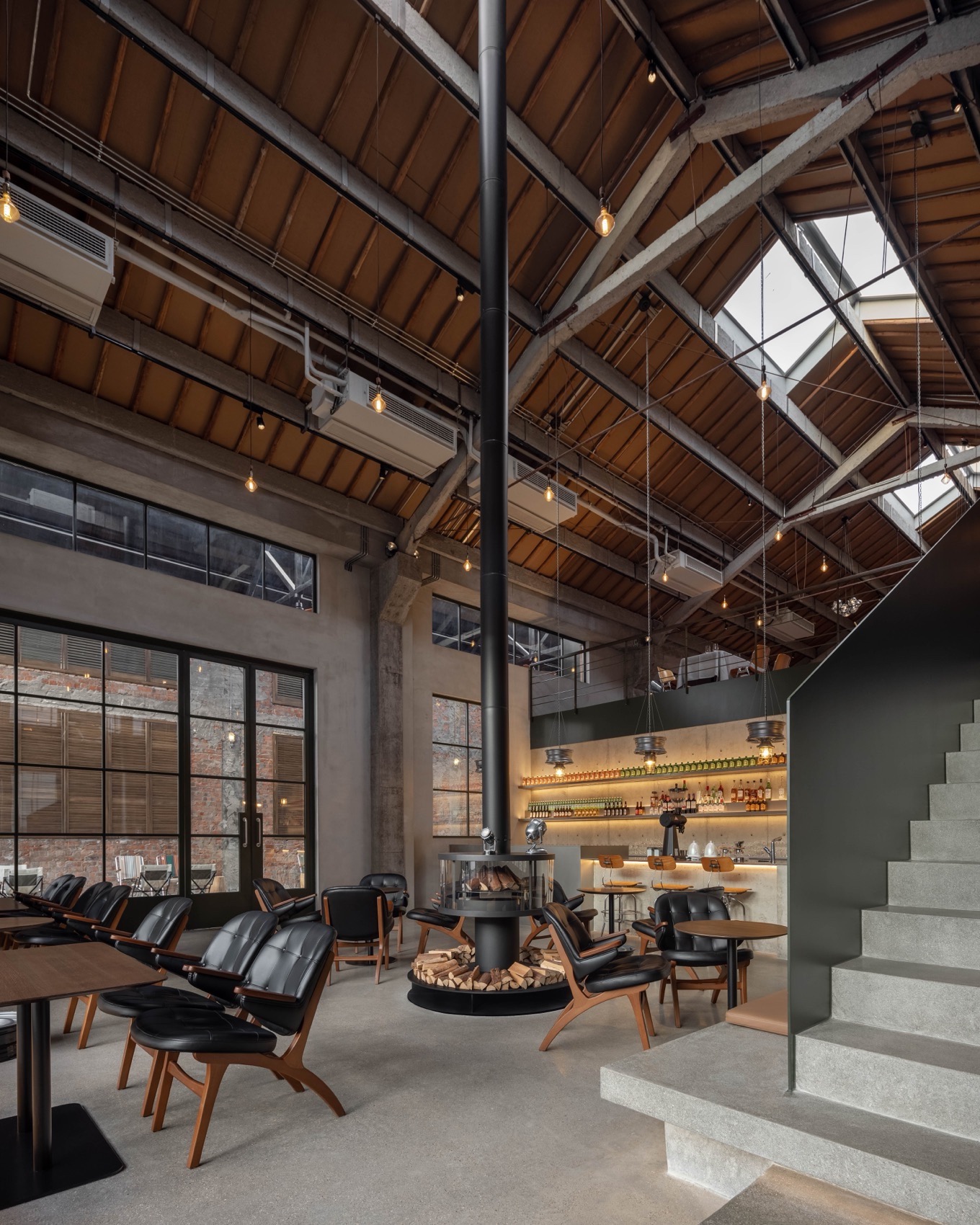 咖啡与复古车分属两种独立文化,是精神食粮与机械质感的碰撞。LUBACK空间中所有的元素都为咖啡/西餐与车服务,打造一家独有的“摩登咖啡加油站”。一楼为咖啡区域,吧台设置在空间内侧,居中的壁炉是大厅的核心,座椅围炉随意摆放,客人们随机落座,相互吸引而又相对独立,正是恰到好处的社交空间。由壁炉逐步向外延伸,是靠窗的餐位,整面折窗向一侧推开,让户外的和风吹入室内,自然呼吸,与庭院由内而外形成一条中轴线,层层递进。