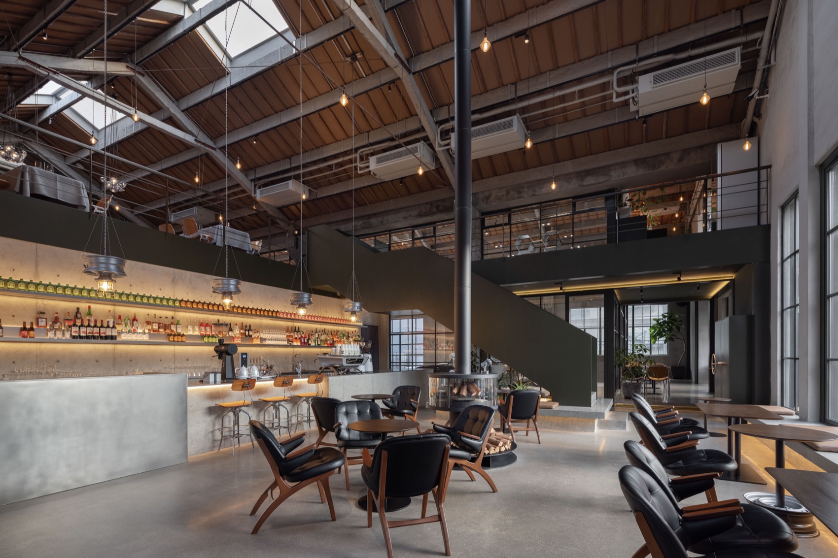 设计中,将原建筑的优势尽可能保留,譬如水泥预制人字梁,混凝土马蹄立柱,牛皮纸屋面饰面,红砖墙面等。而对存在的问题进行了纠偏,拆除室内天桥,使视觉上更为通透;顶面重新翻修并做了天窗采光;外立面拆除部分墙体,增开统一的折叠门窗,既保证车辆频繁出入的需求,也增添了室内外的互动便利,使空间变得开放自由。