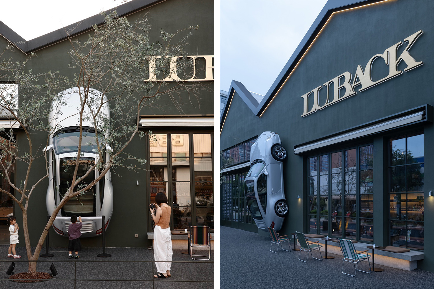 从迷你与阿巴斯的顶部悬挂开始,Uncle Ei玩上了瘾,直接大手笔将保时捷997 Targa真车爬上了外墙。997 Targa是911系列的优雅代名词,这一代Targa采用全玻璃车顶,从顶部俯视可以望见全车内饰。由此为灵感,LUBACK将Targa悬挂上墙,使得客人们从入店的第一视角便能从全玻璃车顶中望见车内,重现经典,真可谓爱之深切,用心良苦。