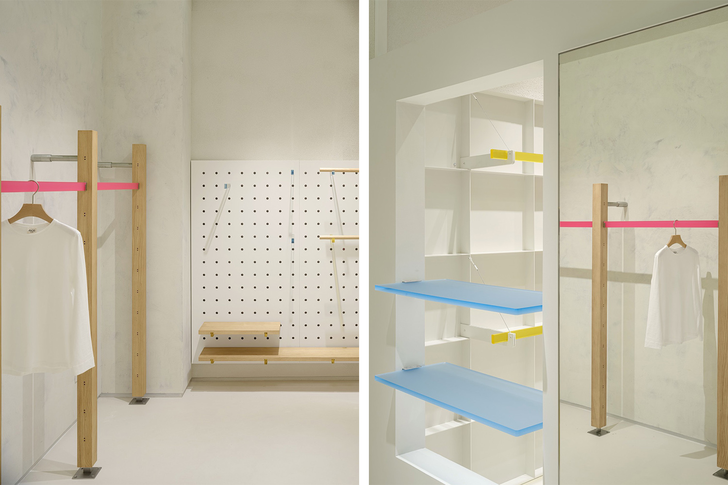 道具的选择配合基础款单品的呈现:从线面块语言提取家具结构,利用白蜡木与彩色亚克力构造家具的质感。玫红,明黄,天蓝,三种颜色的磨砂亚克力以长条形挂杆,片状层板的形式出现,而偶尔出现在洞洞板上的彩色亚克力挂钩的切面,以及木凳家具中零星闪现的斜杆,犹如空间中彩色的点与线。