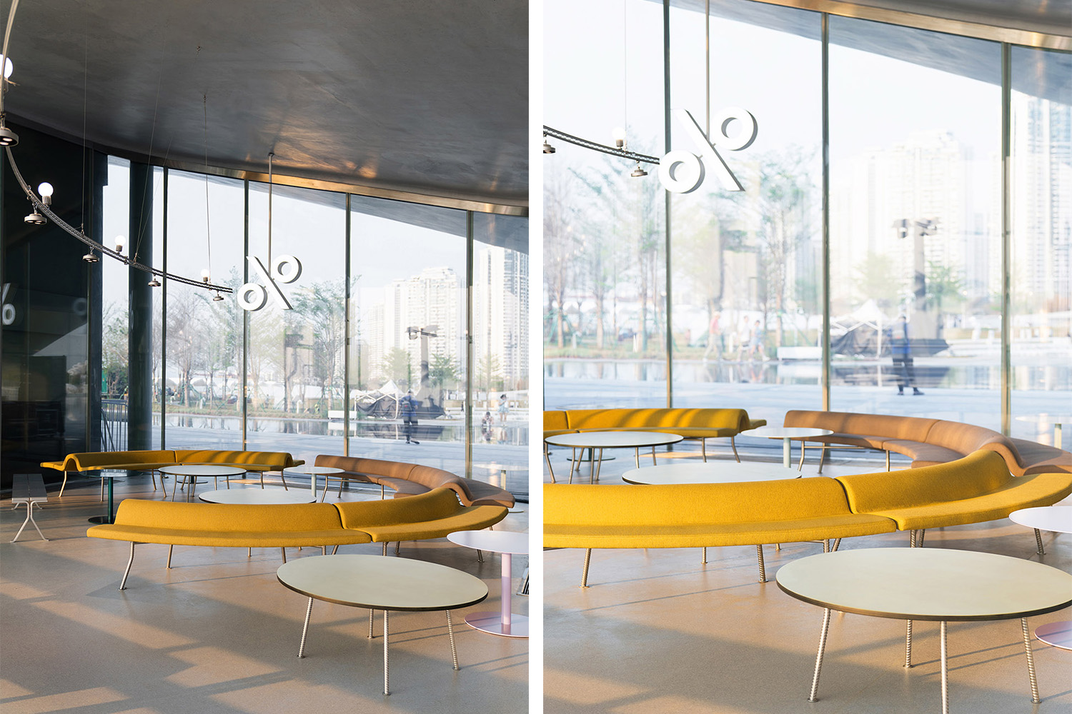 这座异形的建筑室内体量犹如一片海域,大量的市民、游客则像是在其间维锡游动的鱼群。受海洋生物模拟和结构适应的启发,螺旋形平面的咖啡吧台、流体动力形态的坐具、展板和书架,以及环状的灯轨,组成流畅和连续的群岛,又好似散落海底的珊瑚礁,回应空间的伸展和曲张。