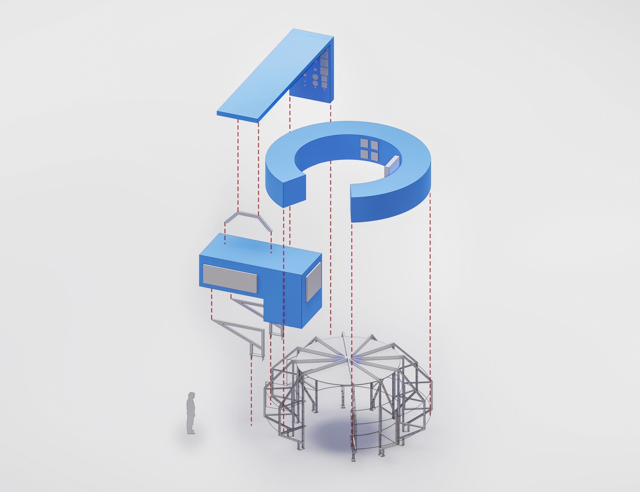 该展厅尝试用信息自生长的逻辑打破这种禁锢。将建筑原本的空间消解,让信息根据自身基因进行实体化演变。结构、力学、材料、造型、媒体设备都是这个信息生长的外延,它们的生长一方面让传播衍生出更多的维度,另一方面也完成对展示空间的规划、构筑、营造。展厅最终是一个可以被穿梭、被感受、被阅读的艺术装置。观展如同在雕塑的体内体外之间中巡游、沉浸,充满探索的乐趣。
