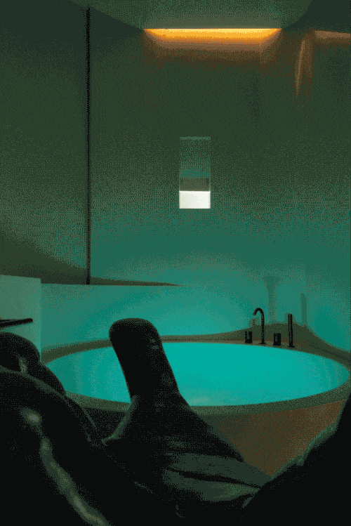 酒吧空间出乎意料地采用了大量圆弧形语汇组成了柔软又未来的包裹形态,完全不同于整体的设计语言昭示着空间的异质性,好似一处降临在家中的一艘飞船,若循着楼梯拾阶而上,坐下的时刻就仿佛畅游于静谧的太空之中,在失重体验的中与另一半现实的世界断联。