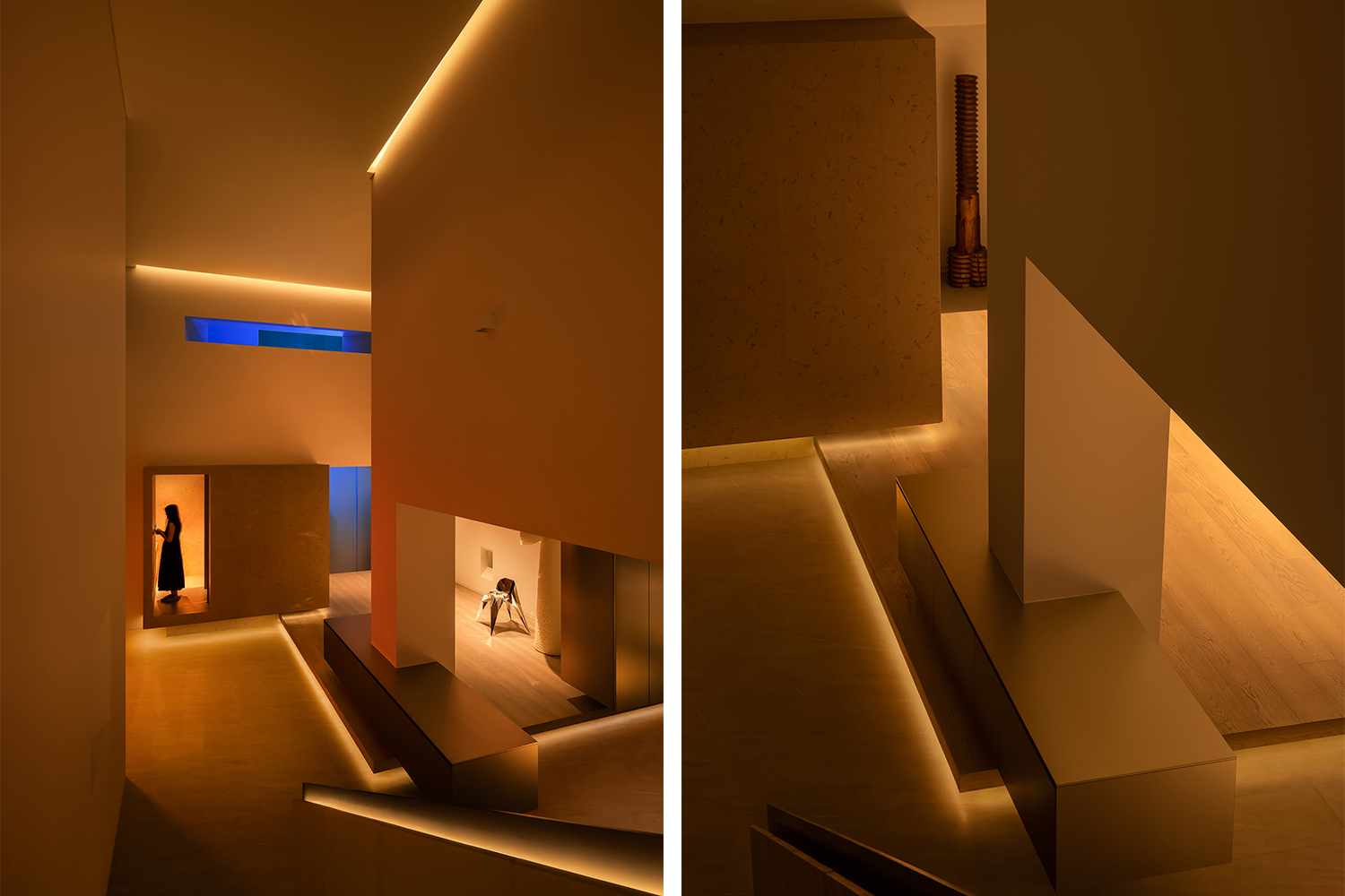 与楼上所承载的一家老少的生活日常所不同的,地下两层更像是安放主人自我的精神栖息地。楼梯经过动线梳理后,挪至空间的中心,以一段朴直平缓的的楼梯入大道一般指引预示着转换与连接,让人伴随着灯光线索踏入地下的精神之园林,又可循着日光回归现实的日常。