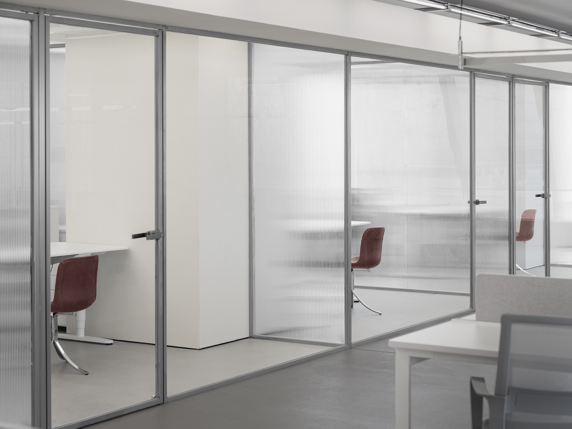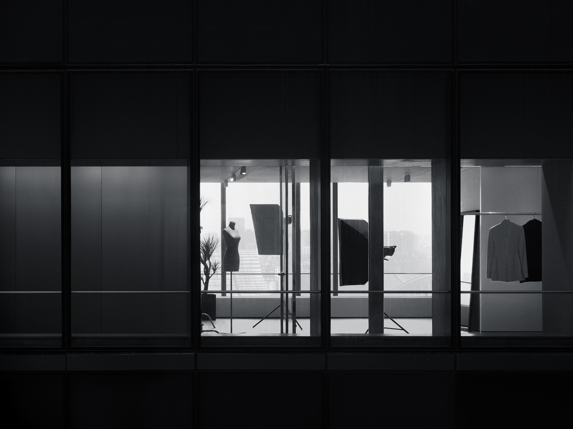 第一组团除了具备接待、泊客功能,中间还有一个不锈钢展架用来陈列品牌历年出版物,以类似小型展览的方式,将印象中机械呆板的总部前台打造成具有建档、艺术装置和互动性质的品牌输出点位。第二组团由三个配备智能预约系统的会议室组成,大间可容纳30人,两小间可分别容纳6~10人;金属板向两侧拉开可作为白板使用。位于场地北侧的第五、六组团构成高效功能中枢,拍摄空间与展厅以及相邻的技术空间(纸样间、车板间、裁床间等)服务于UENS、YP两大产品线。