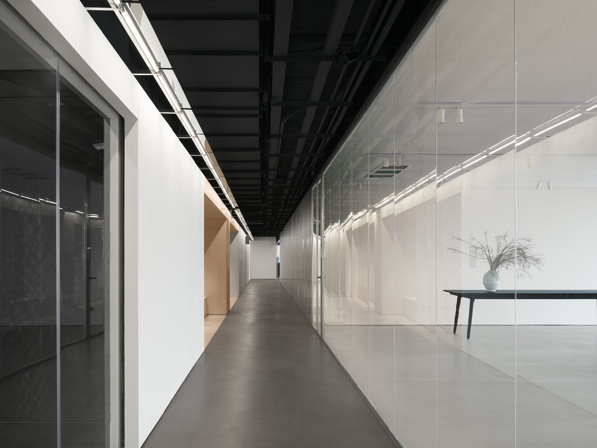 走廊界面整合了多个功能单元出入口,金属、玻璃、木料、墙面四种界面材质的有机衔接,制造出清晰的空间转换感。
