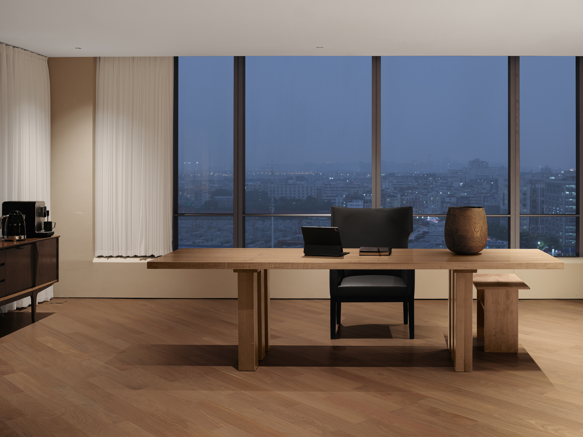 空间整体状态趋近中性,可以包容与制衡不同审美取向,随人和时间变化。设计手法因此比较克制,避免过度风格化的同时保证实用性、降低维护成本。淡化的设计痕迹也不会过多分散员工注意力或是介入他们的工作日常。这一理念决定了材料的挑选标准,首先要满足高效耐久。地面使用混凝土自流平;家具多使用不锈钢;涂料、肌理漆以半哑光灰色为主,和浅色木纹、深色金属饰面搭配,铺就出前卫工业的空间肌理。